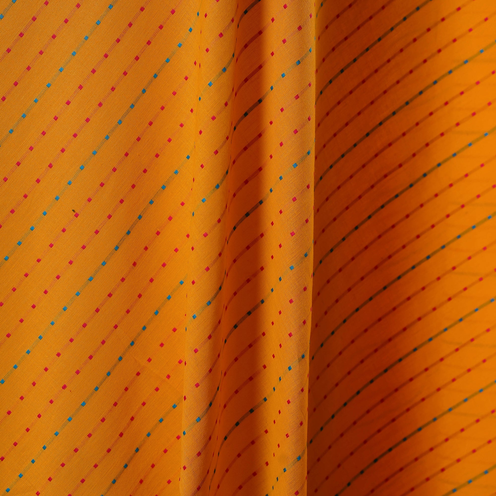 Woven in Tamil Nadu, this orange jacquard cotton fabric showcases a traditionally inspired pattern created through modern jacquard weaving. Its prewashed finish lends a smooth, soft touch, making it ideal for kurtas, dresses, or home décor accents. Though machine-woven, it beautifully captures the richness of India’s textile heritage.