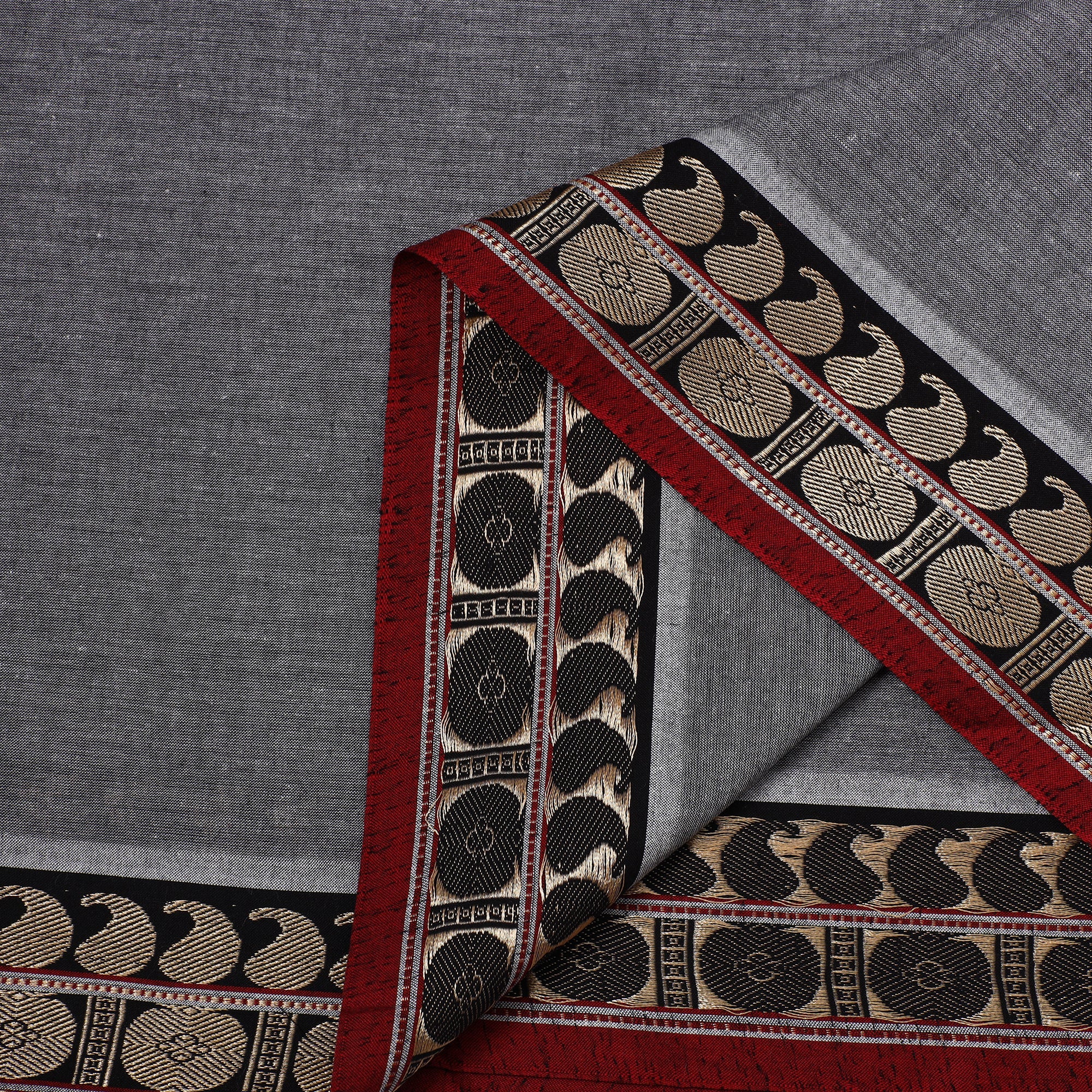 Fine-quality grey prewashed dharwad cotton fabric with a traditional thread-woven border from Dharwad, Karnataka. Machine-made with no handmade process involved. Perfect for clothing, home decor, and creative craft projects, this fabric brings a heritage-inspired touch to your creations.
