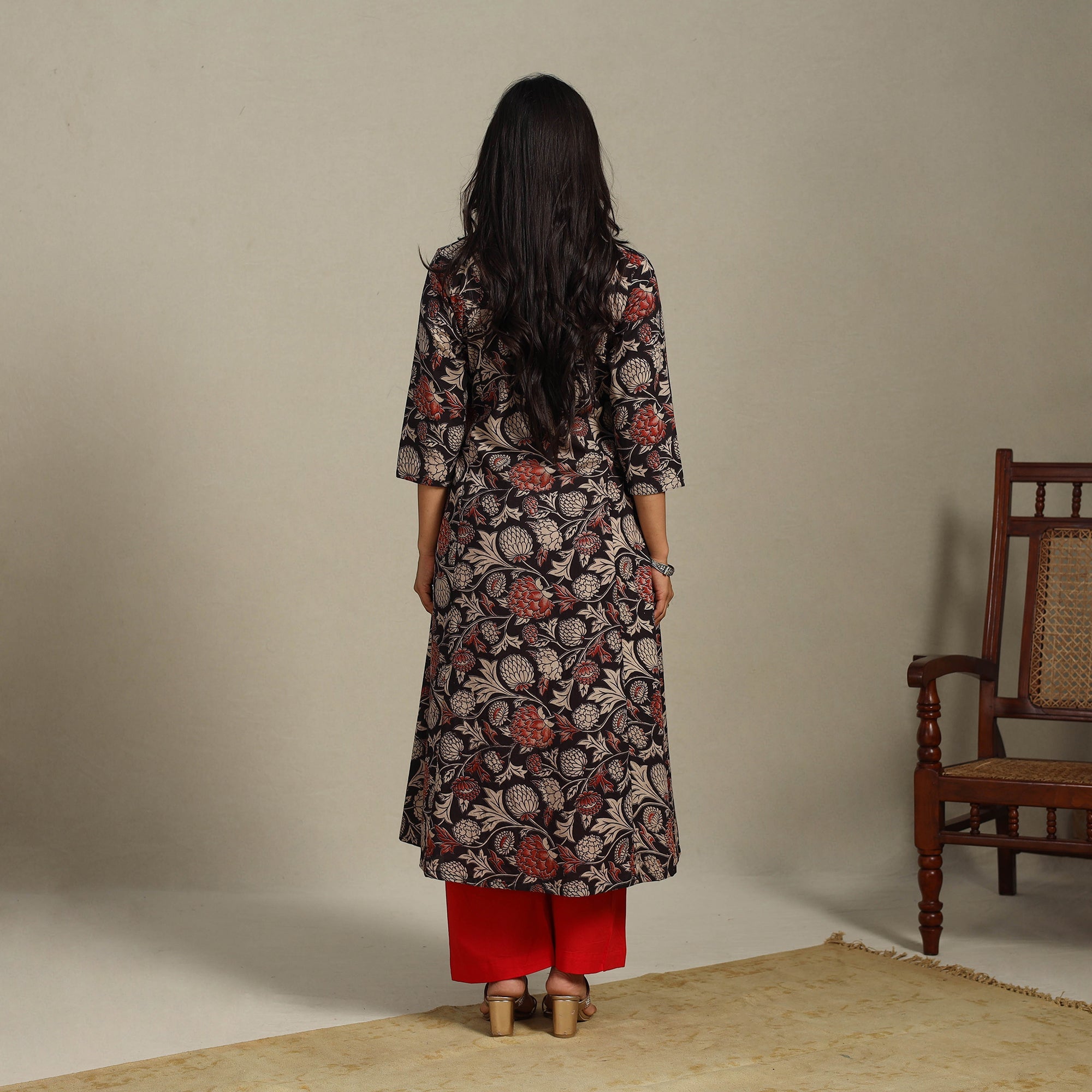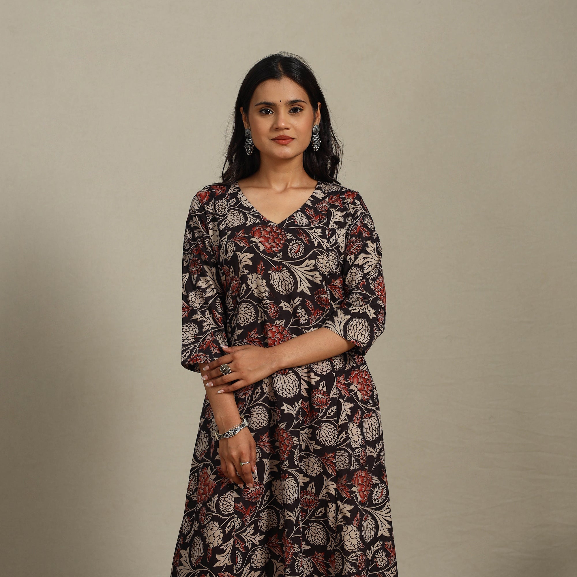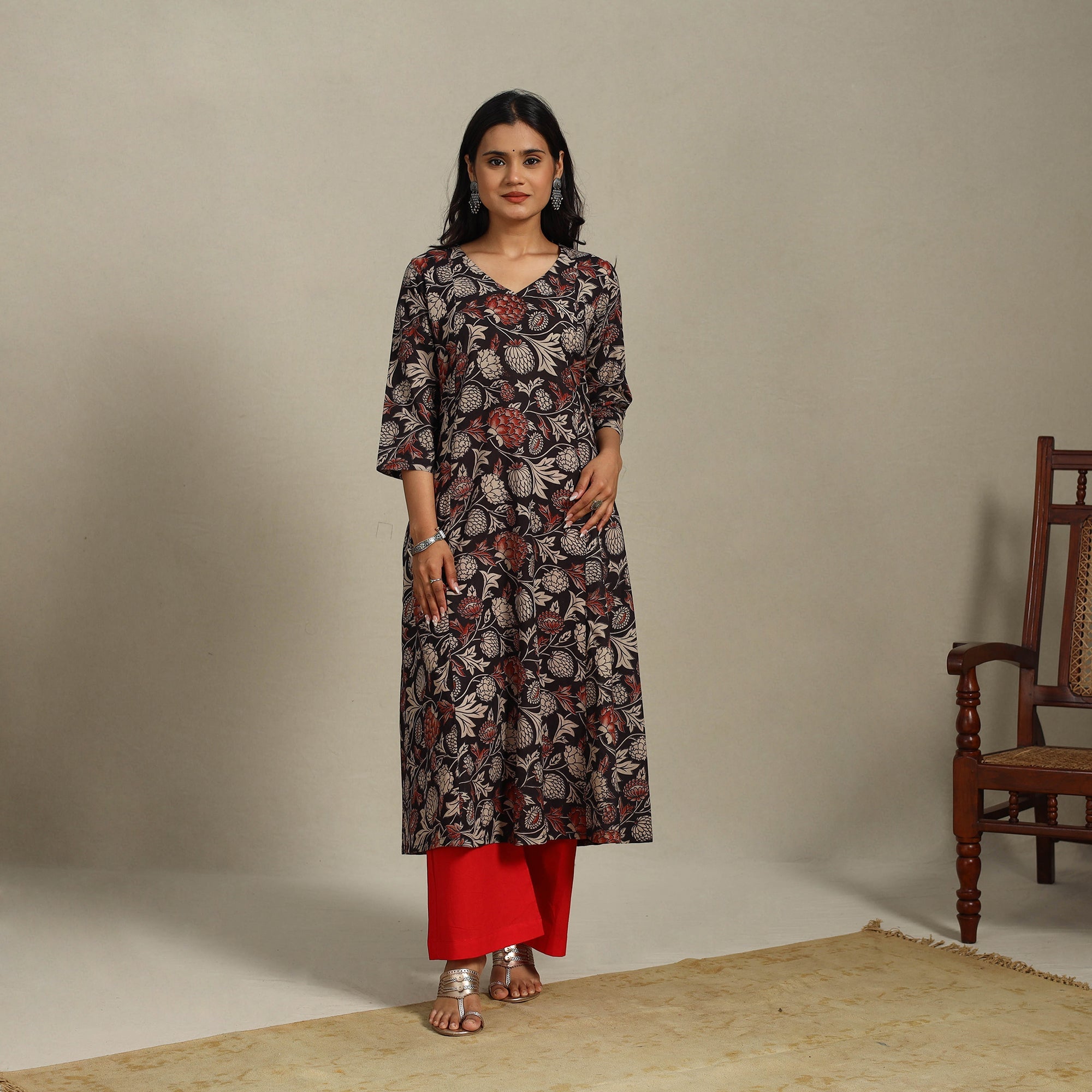 Stay comfortable all day in this black screen-printed cotton A-line kurta featuring Kalamkari-inspired motifs. Crafted from breathable fabric, the lightweight material feels gentle on the skin and offers both style and ease of movement. Designed with a functional side pocket, it’s ideal for festive gatherings, casual outings, or everyday workwear.