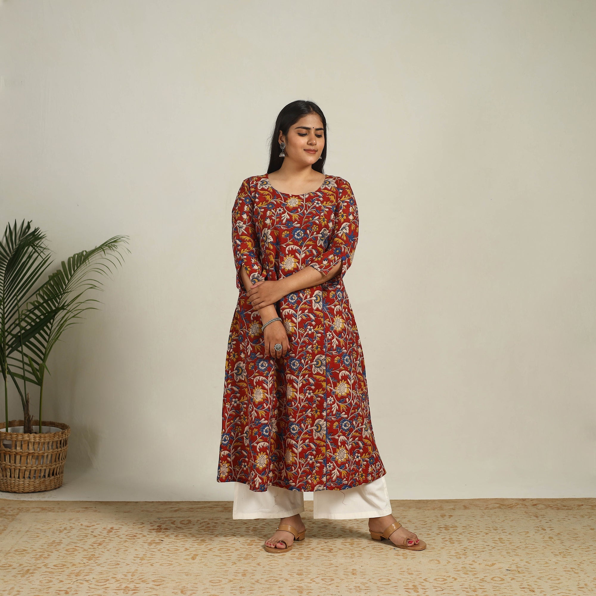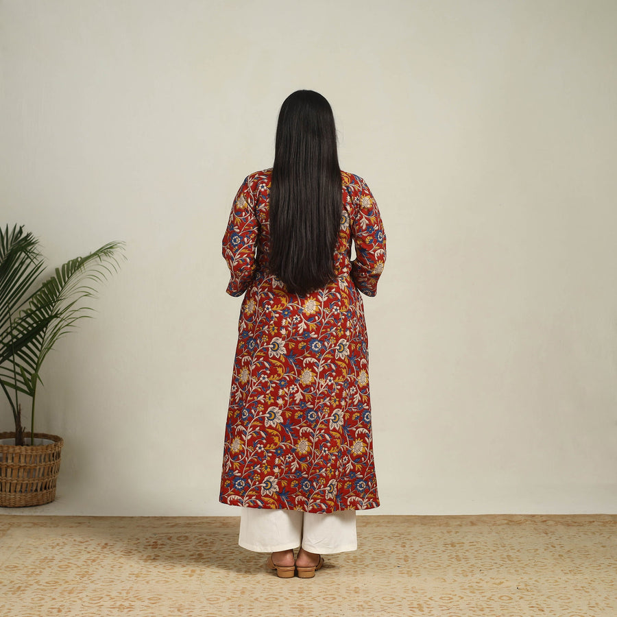 This red screen printed cotton a-line kalamkari kurta keeps you comfortable all day made from breathable cotton. The lightweight fabric drapes effortlessly, offering both style and ease of movement with a designed side pocket. Perfect for festive gatherings, casual outings, or workwear.