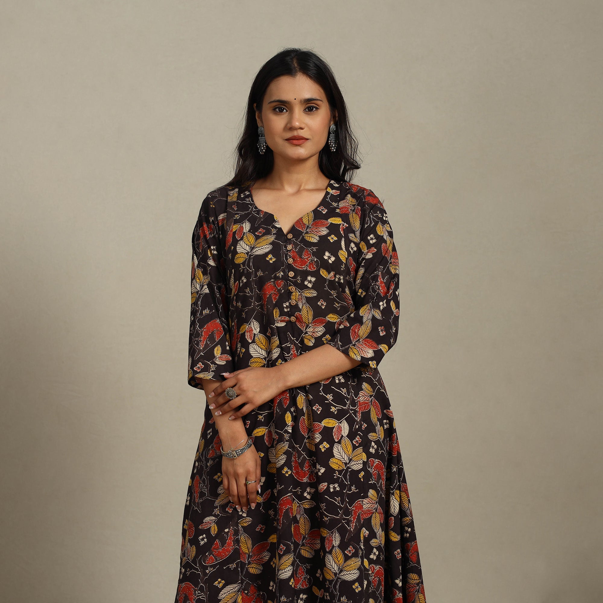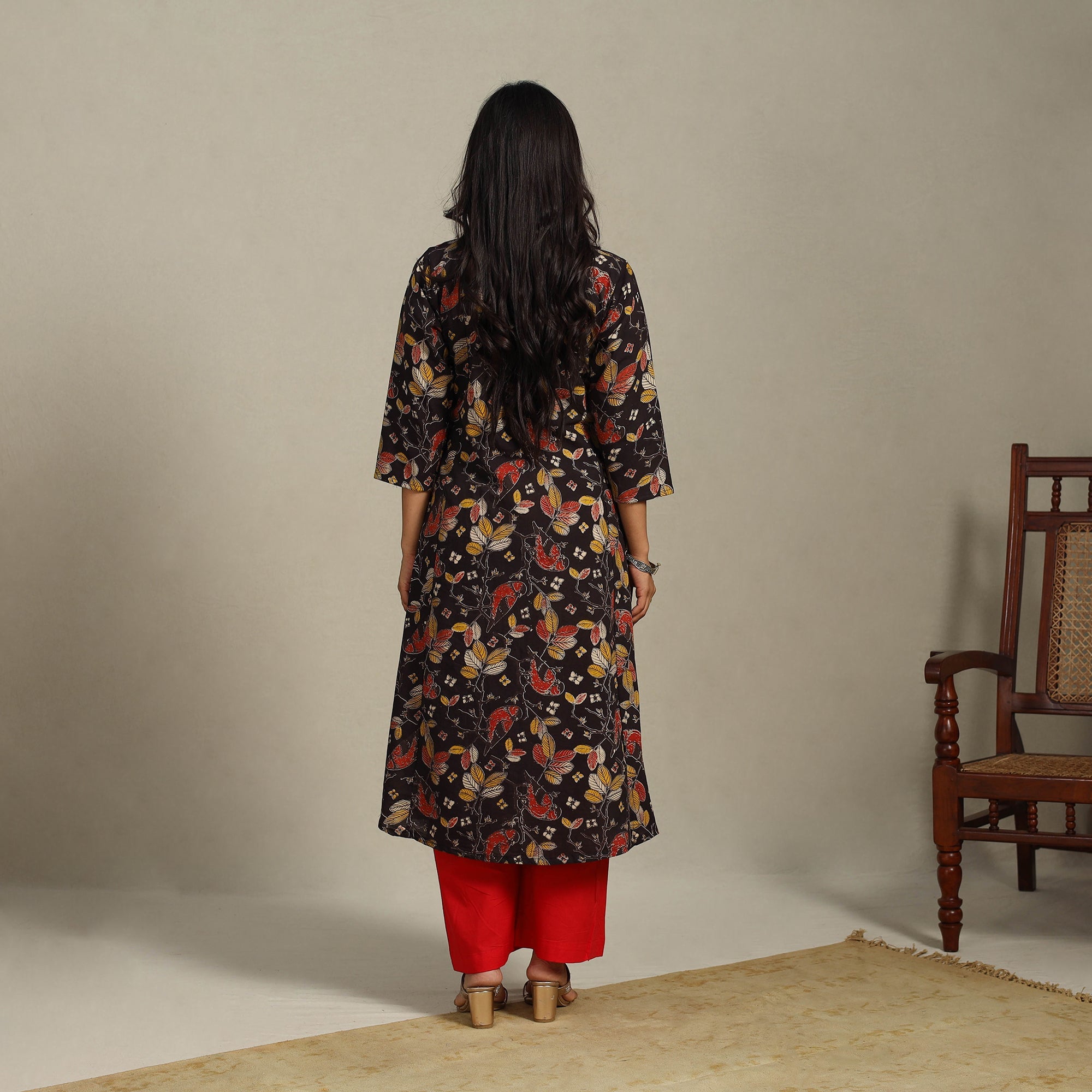 Stay comfortable all day in this black screen-printed cotton A-line kurta featuring Kalamkari-inspired motifs. Crafted from breathable fabric, the lightweight material feels gentle on the skin and offers both style and ease of movement. Designed with a functional side pocket, it’s ideal for festive gatherings, casual outings, or everyday workwear.