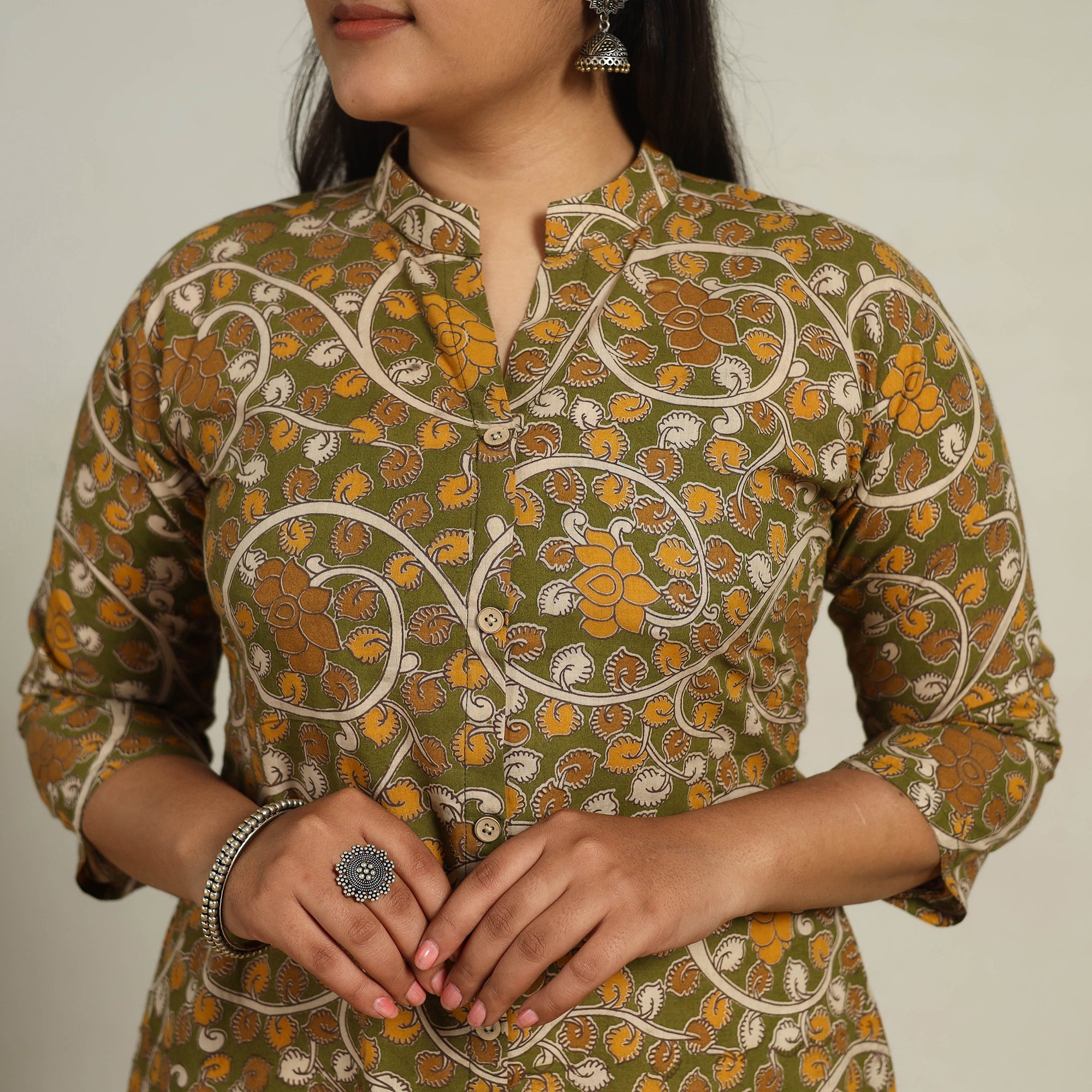 This green screen printed cotton a-line kalamkari kurta keeps you comfortable all day made from breathable cotton. The lightweight fabric drapes effortlessly, offering both style and ease of movement with a designed side pocket. Perfect for festive gatherings, casual outings, or workwear.