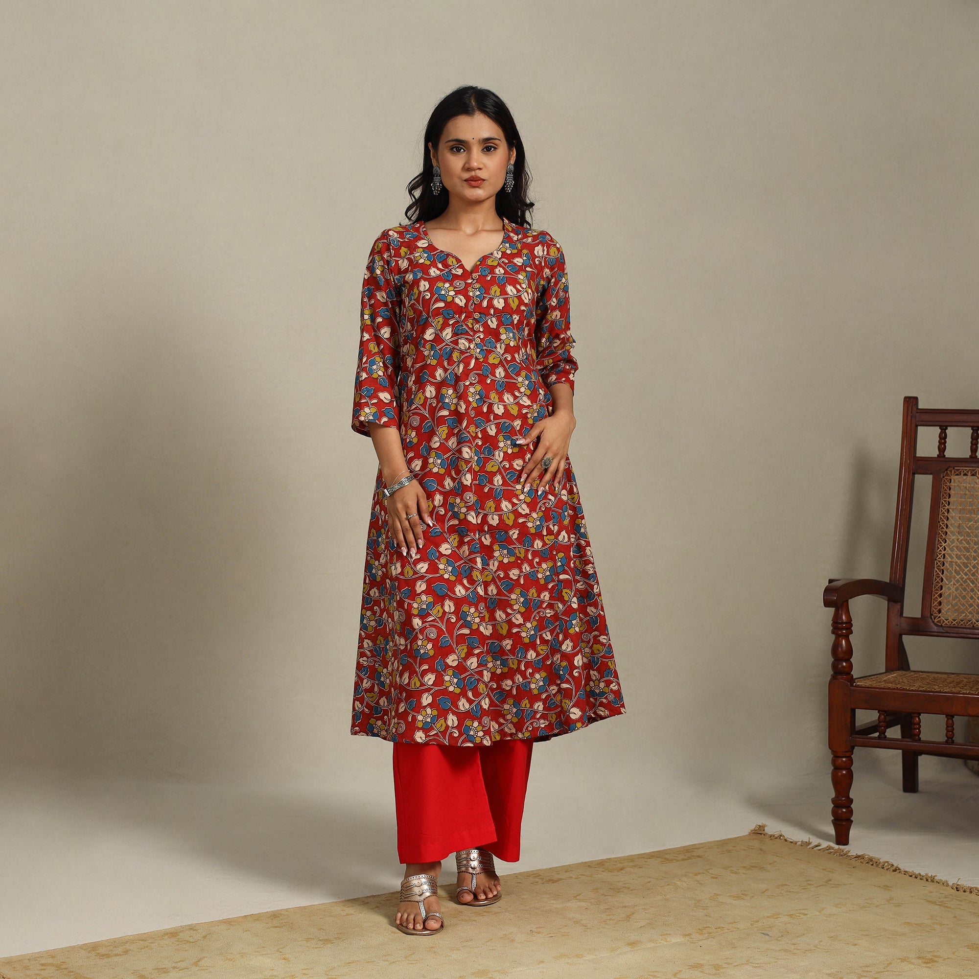 Stay comfortable all day in this red screen-printed cotton A-line kurta featuring Kalamkari-inspired motifs. Crafted from breathable fabric, the lightweight material feels gentle on the skin and offers both style and ease of movement. Designed with a functional side pocket, it’s ideal for festive gatherings, casual outings, or everyday workwear.