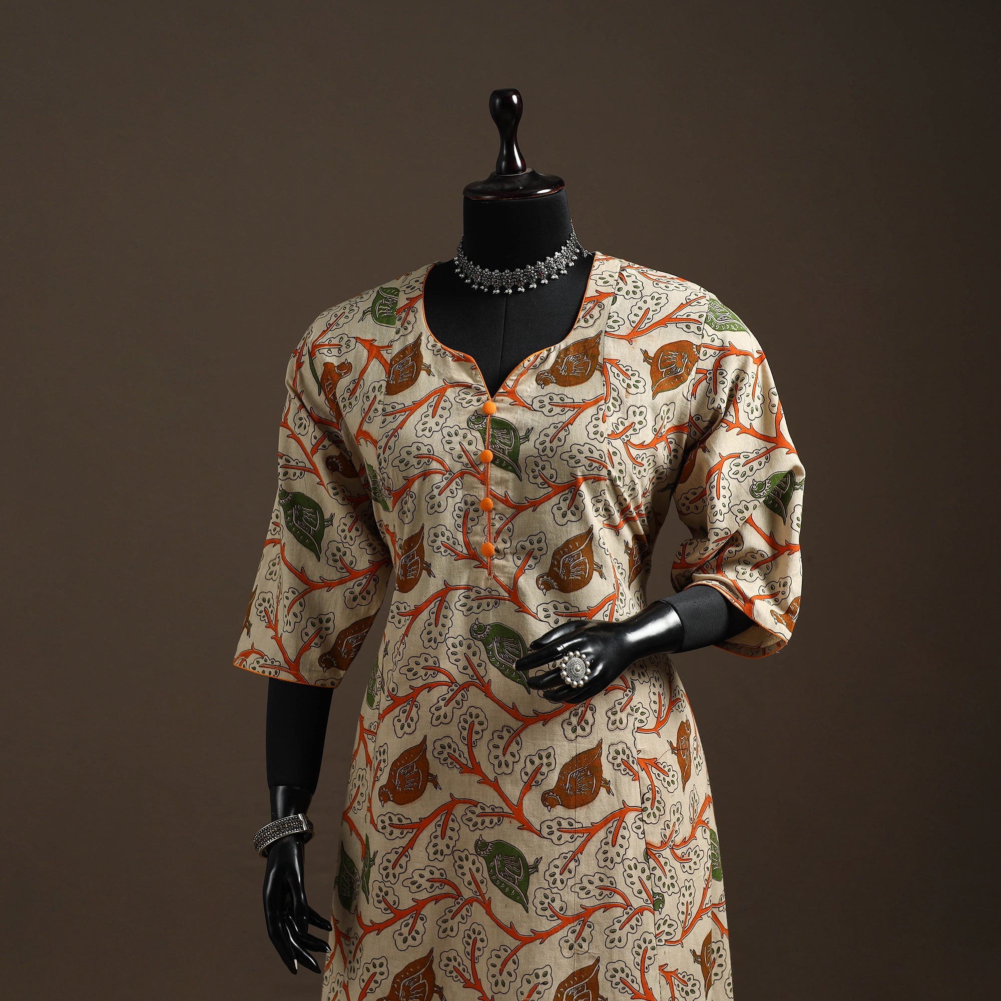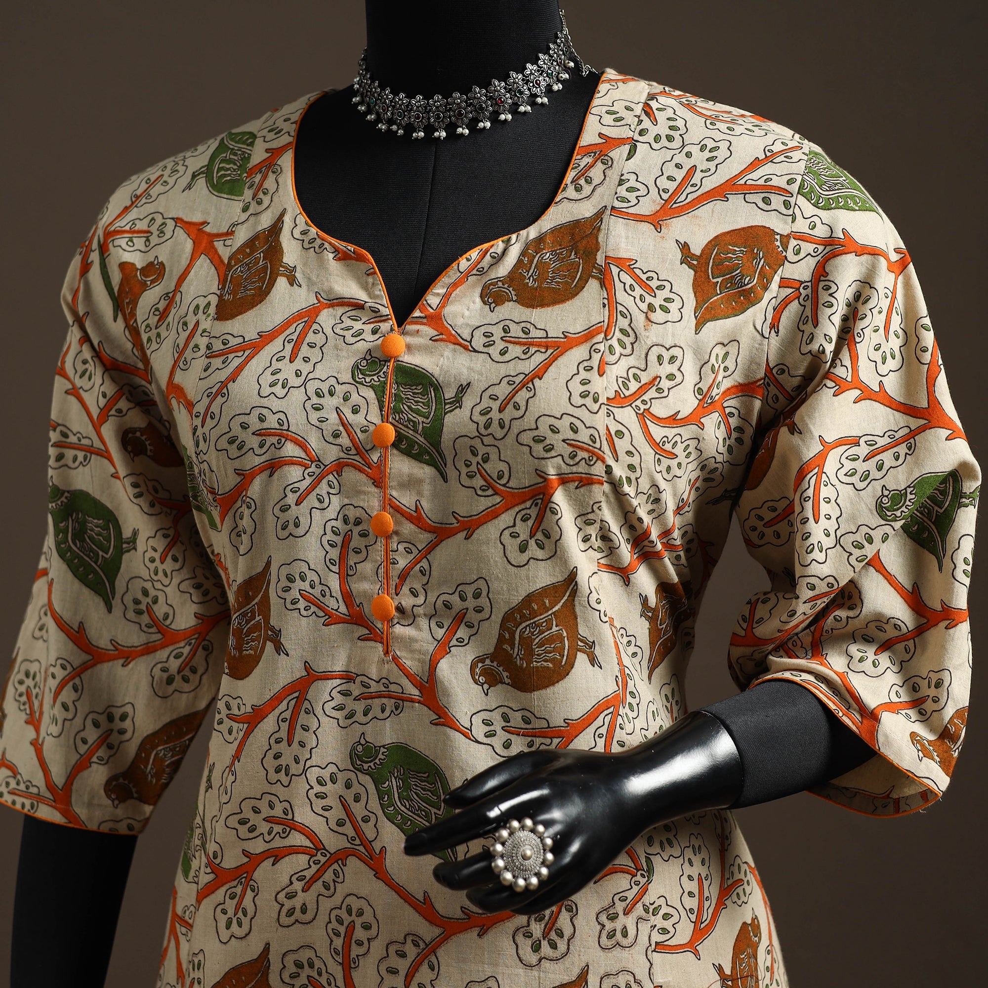 Feel relaxed and stylish all day in this screen-printed a-line kurta featuring kalamkari-inspired motifs. Made from breathable cotton fabric, its lightweight material feels soft on the skin. With a functional side pocket, it’s perfect for festive gatherings, casual outings or everyday workwear.
