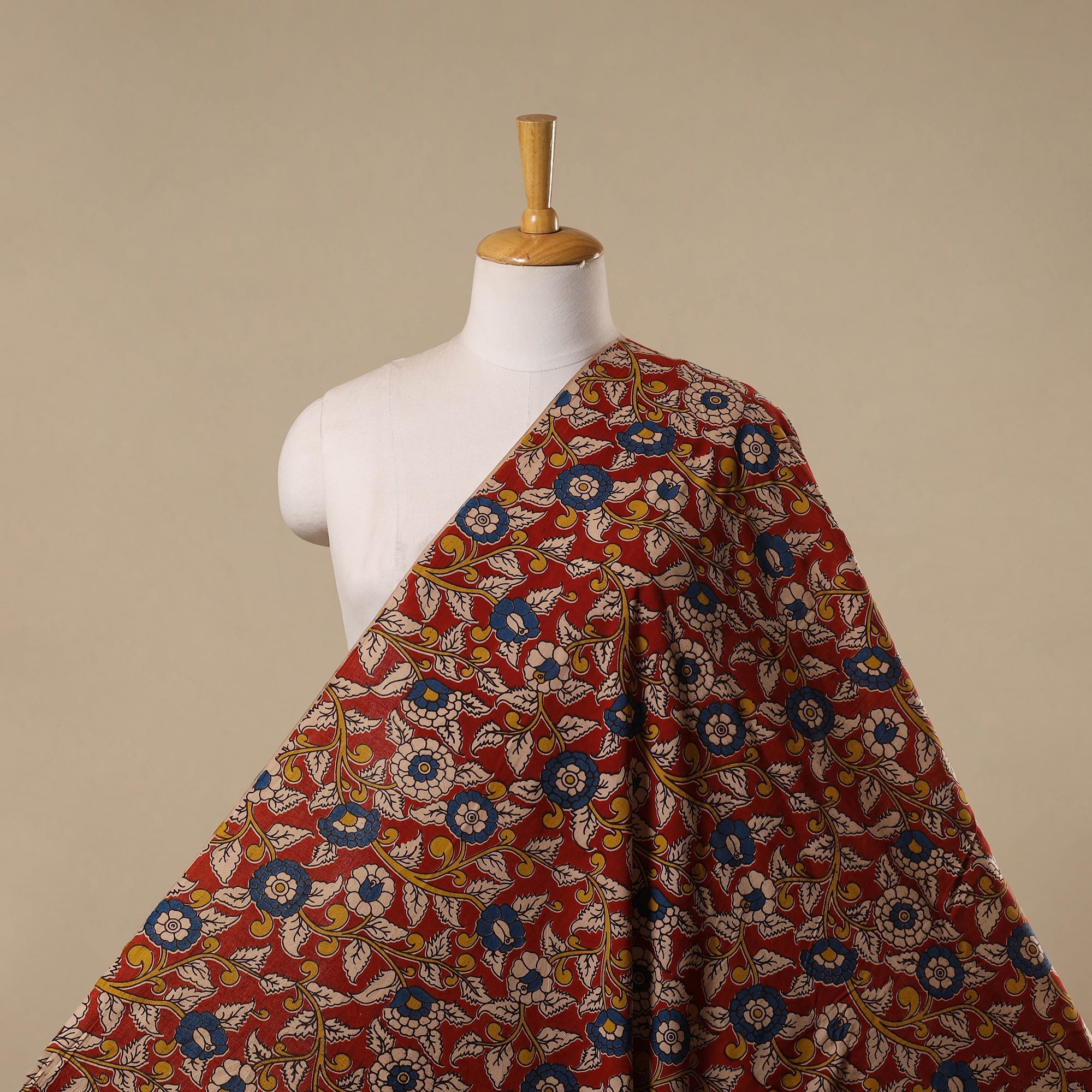 This red fabric features screen-printed motifs inspired by traditional kalamkari art, known for its storytelling patterns. The design includes florals, vines, figures and elephants. Made from comfortable pure cotton, it is easy to stitch and works well for kurtas, dresses, blouses, home decor pieces and other sewing projects.
