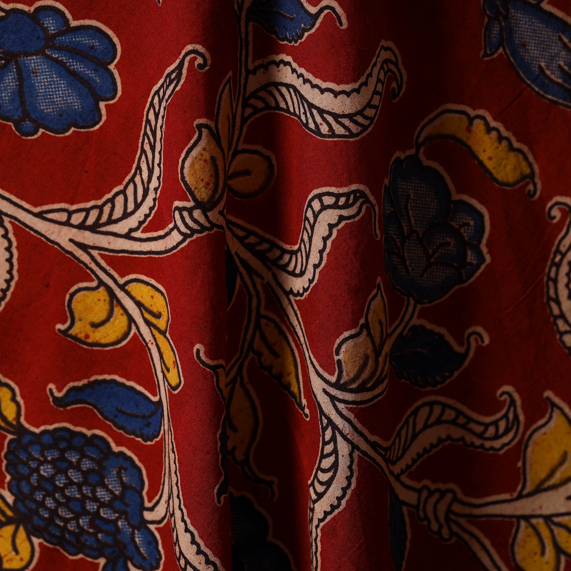 This red fabric features screen-printed motifs inspired by traditional kalamkari art, known for its storytelling patterns. The design includes florals, vines, figures and elephants. Made from comfortable pure cotton, it is easy to stitch and works well for kurtas, dresses, blouses, home decor pieces and other sewing projects.