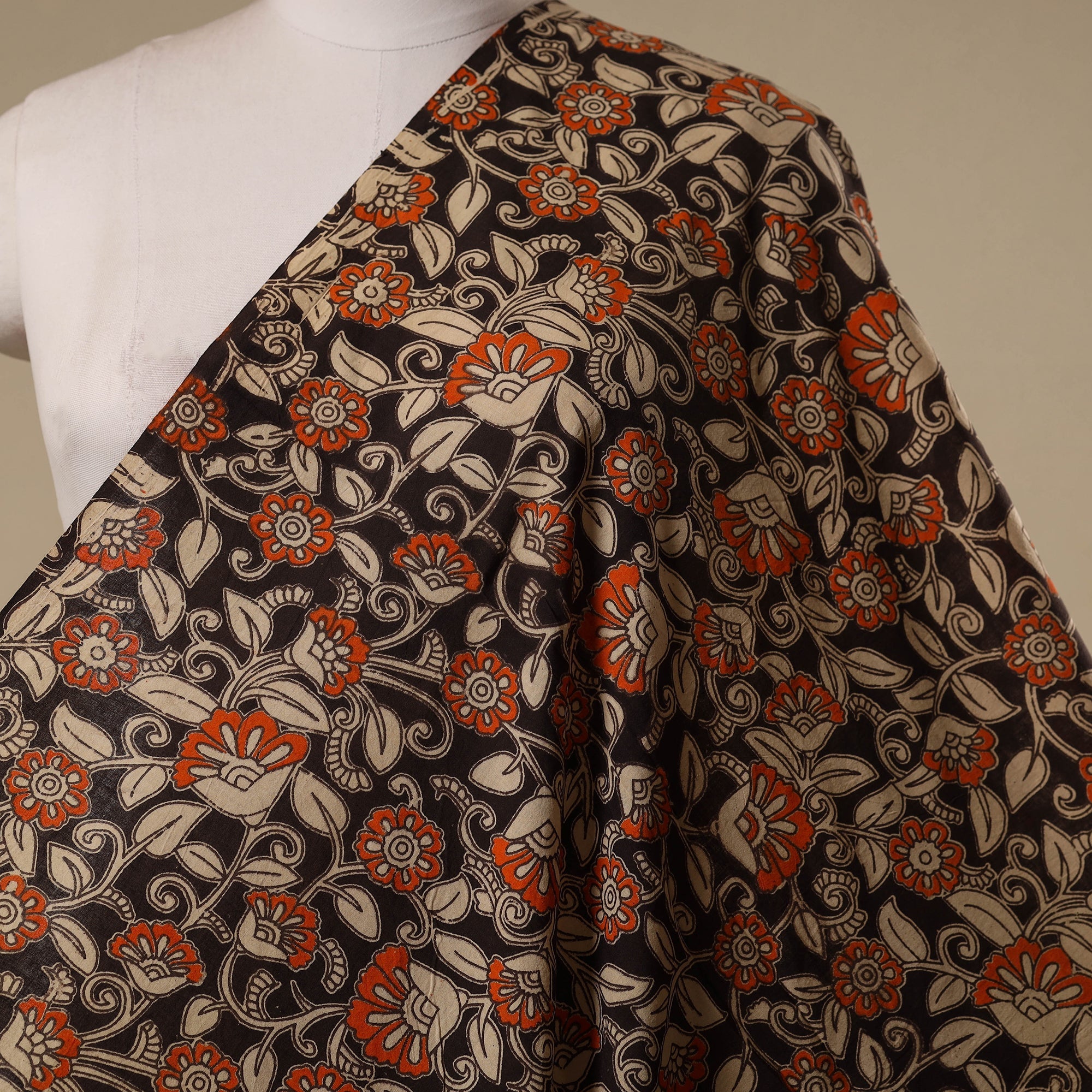 This black fabric features screen-printed motifs inspired by traditional kalamkari art, known for its storytelling patterns. The design includes florals, vines, figures and elephants. Made from comfortable pure cotton, it is easy to stitch and works well for kurtas, dresses, blouses, home decor pieces and other sewing projects.