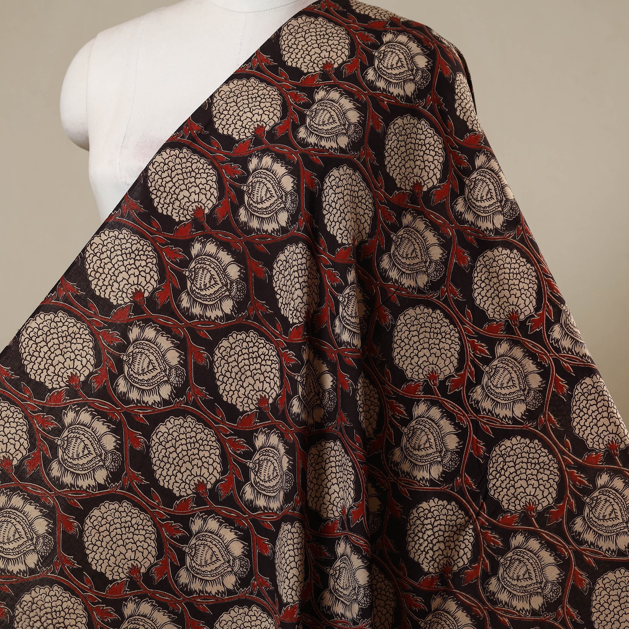 This black cotton fabric celebrates the charm of kalamkari art, renowned for its intricate and storytelling motifs. Showcasing finely printed patterns inspired by florals, vines, figures, and elephants, each detail lends a distinctive character to the fabric. Crafted by skilled artisans from Andhra Pradesh, it is perfect for designing unique garments, striking home décor, or anything that deserves a touch of cultural elegance.