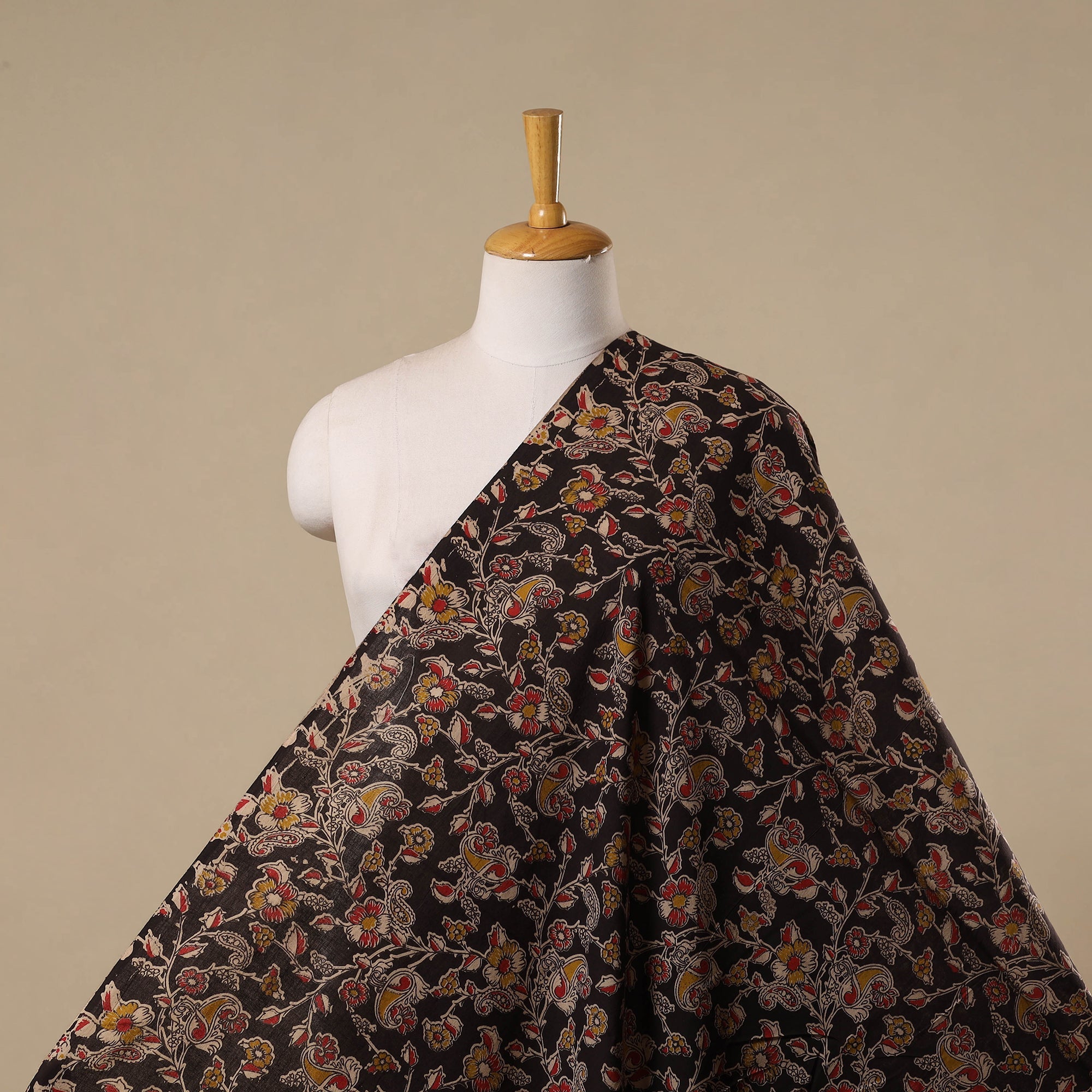 This black fabric features screen-printed motifs inspired by traditional kalamkari art, known for its storytelling patterns. The design includes florals, vines, figures and elephants. Made from comfortable pure cotton, it is easy to stitch and works well for kurtas, dresses, blouses, home decor pieces and other sewing projects.