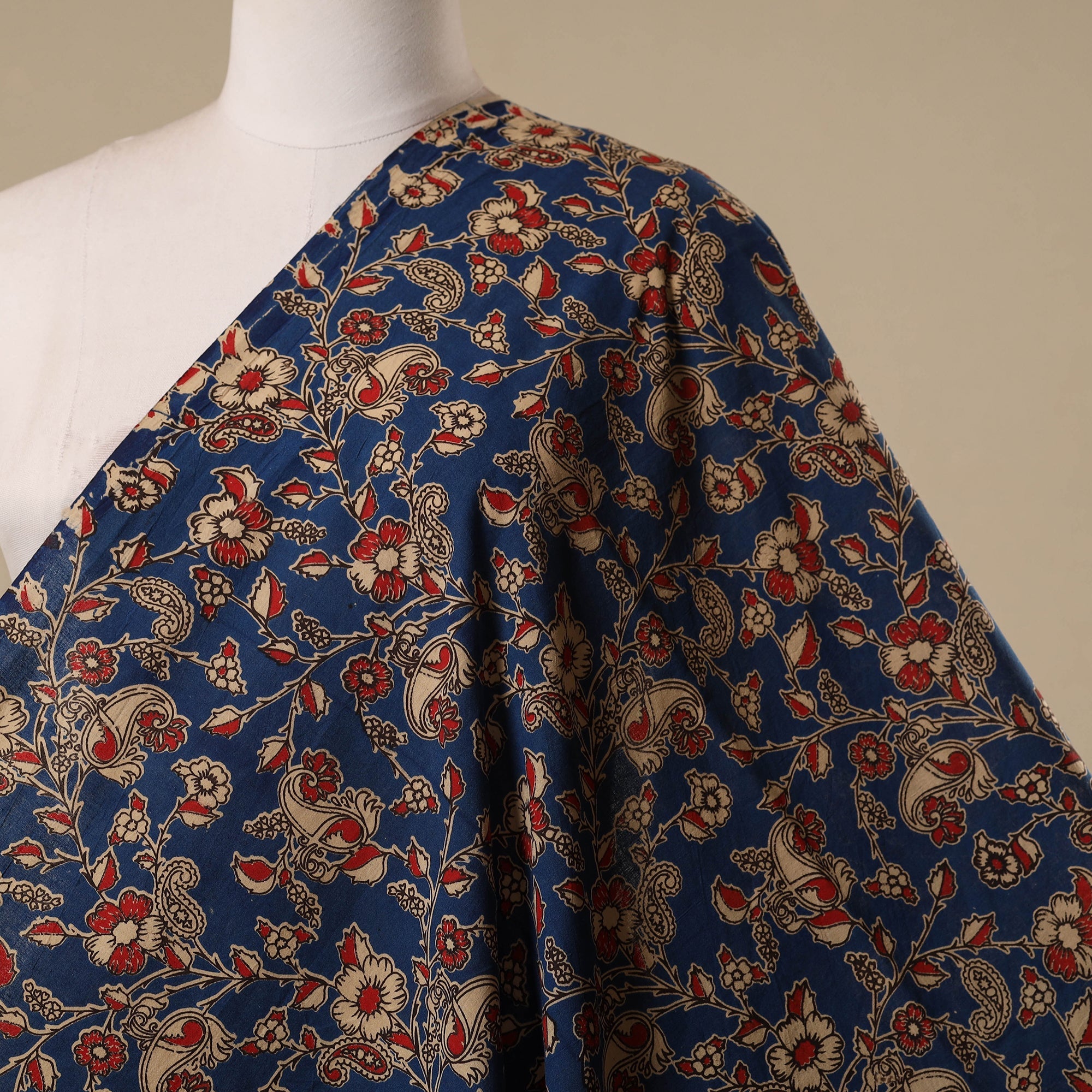 This blue fabric features screen-printed motifs inspired by traditional kalamkari art, known for its storytelling patterns. The design includes florals, vines, figures and elephants. Made from comfortable pure cotton, it is easy to stitch and works well for kurtas, dresses, blouses, home decor pieces and other sewing projects.