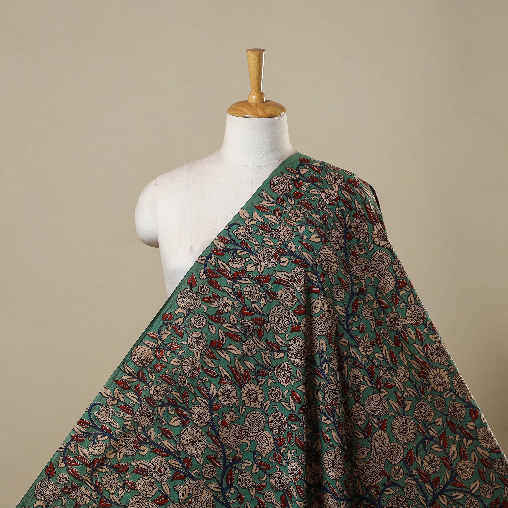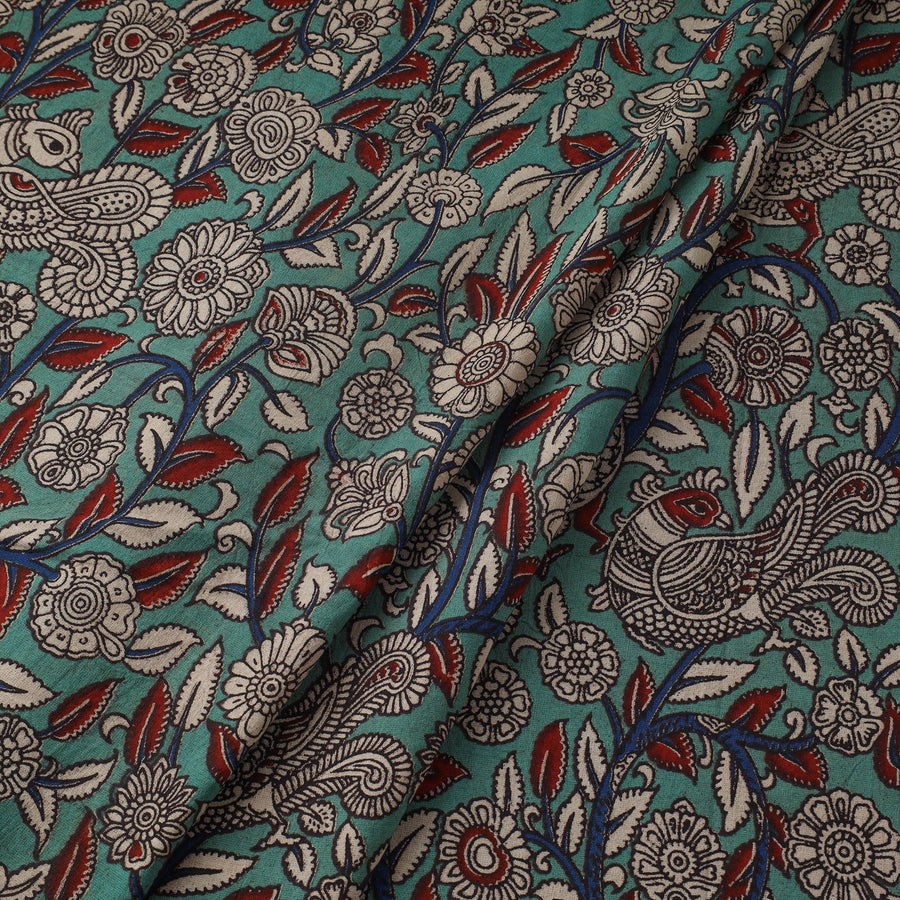 This fabric features screen-printed motifs inspired by traditional kalamkari art, known for its storytelling patterns. The design includes florals, vines, figures and elephants. Made from comfortable pure cotton, it is easy to stitch and works well for kurtas, dresses, blouses, home decor pieces and other sewing projects.
