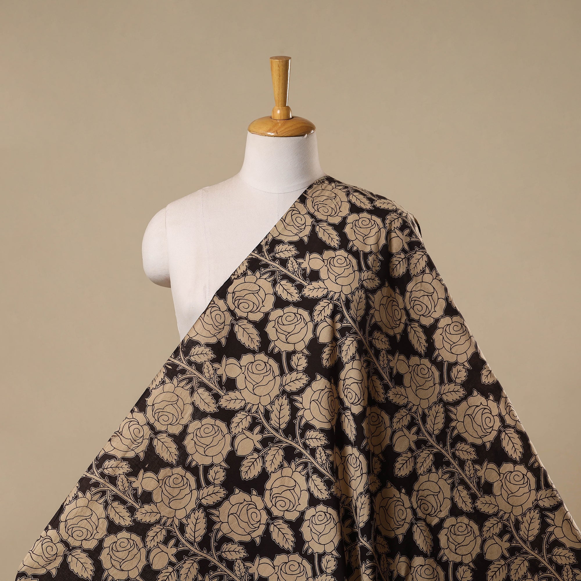 This black fabric features screen-printed motifs inspired by traditional kalamkari art, known for its storytelling patterns. The design includes florals, vines, figures and elephants. Made from comfortable pure cotton, it is easy to stitch and works well for kurtas, dresses, blouses, home decor pieces and other sewing projects.