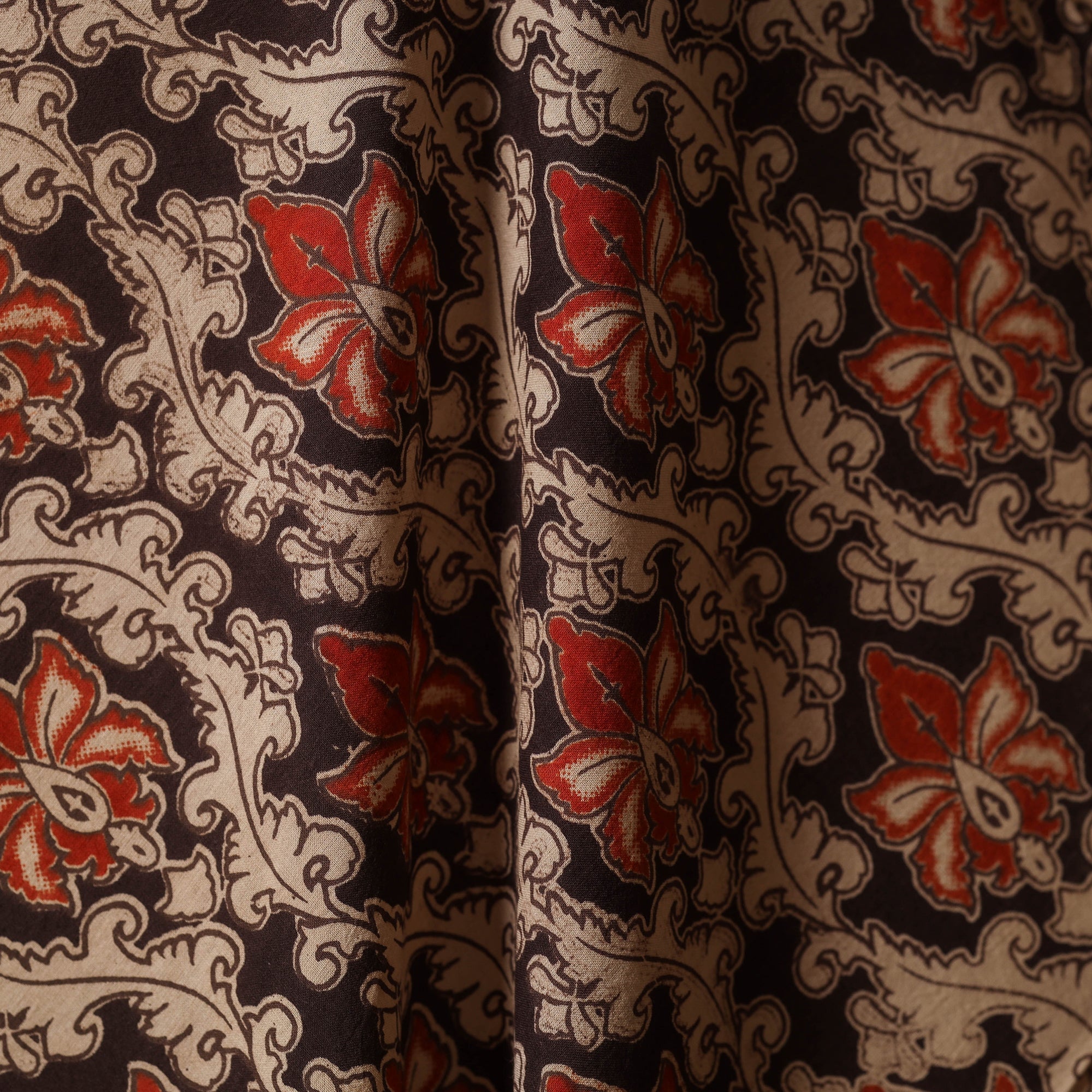 This black fabric features screen-printed motifs inspired by traditional kalamkari art, known for its storytelling patterns. The design includes florals, vines, figures and elephants. Made from comfortable pure cotton, it is easy to stitch and works well for kurtas, dresses, blouses, home decor pieces and other sewing projects.
