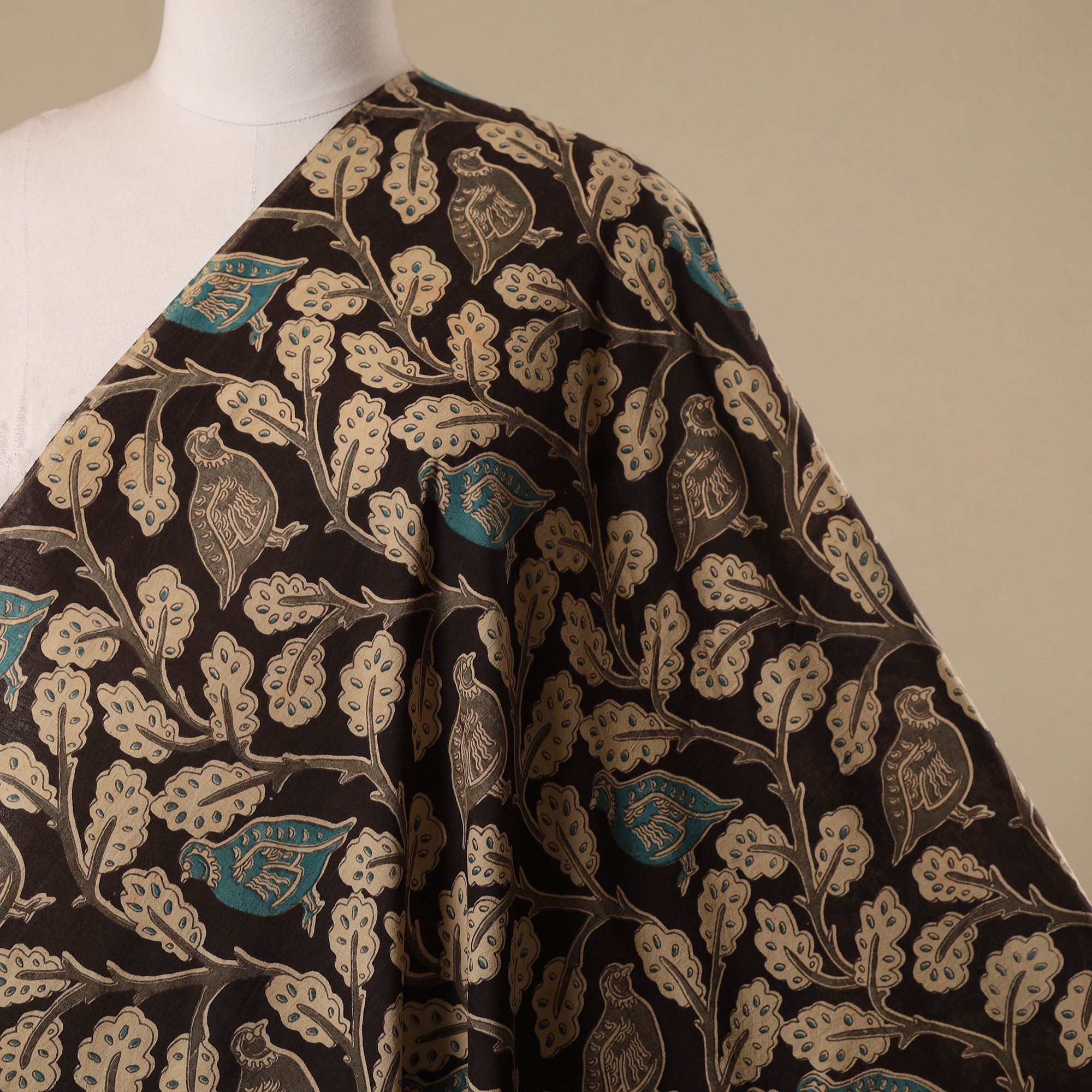 This black fabric features screen-printed motifs inspired by traditional kalamkari art, known for its storytelling patterns. The design includes florals, vines, figures and elephants. Made from comfortable pure cotton, it is easy to stitch and works well for kurtas, dresses, blouses, home decor pieces and other sewing projects.