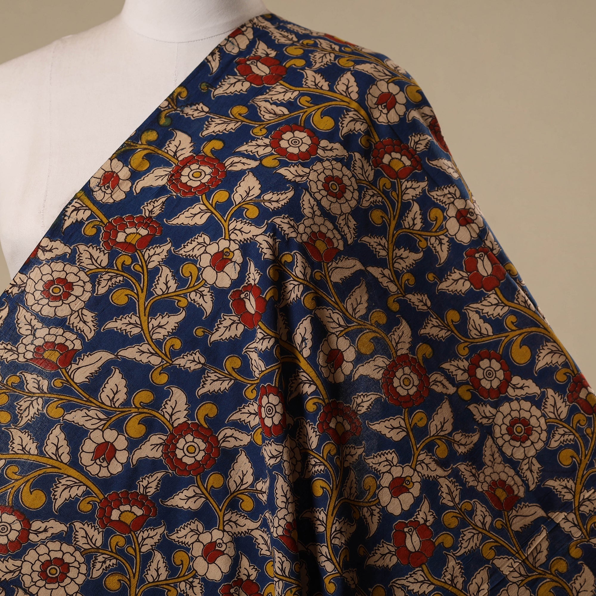 This blue fabric features screen-printed motifs inspired by traditional kalamkari art, known for its storytelling patterns. The design includes florals, vines, figures and elephants. Made from comfortable pure cotton, it is easy to stitch and works well for kurtas, dresses, blouses, home decor pieces and other sewing projects.