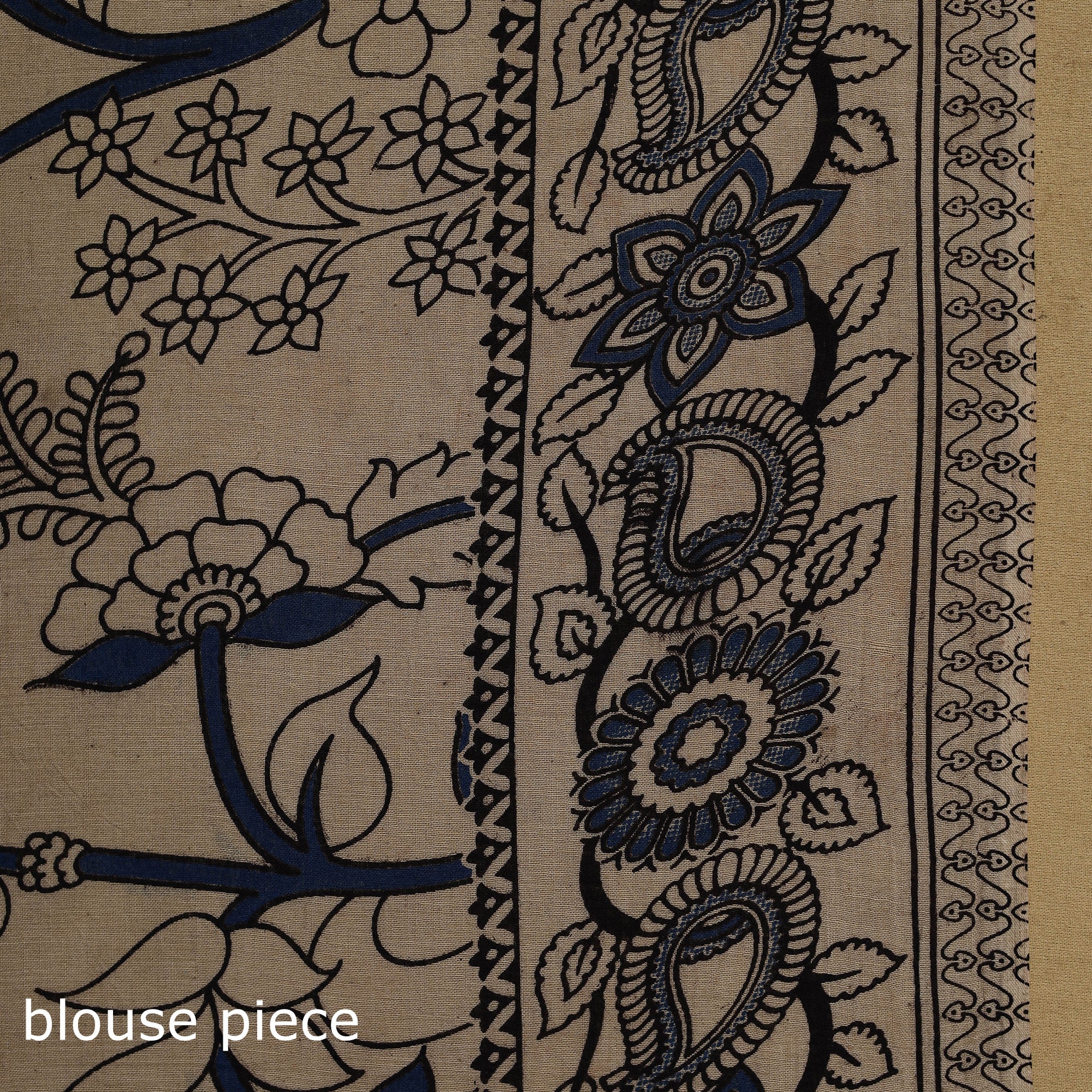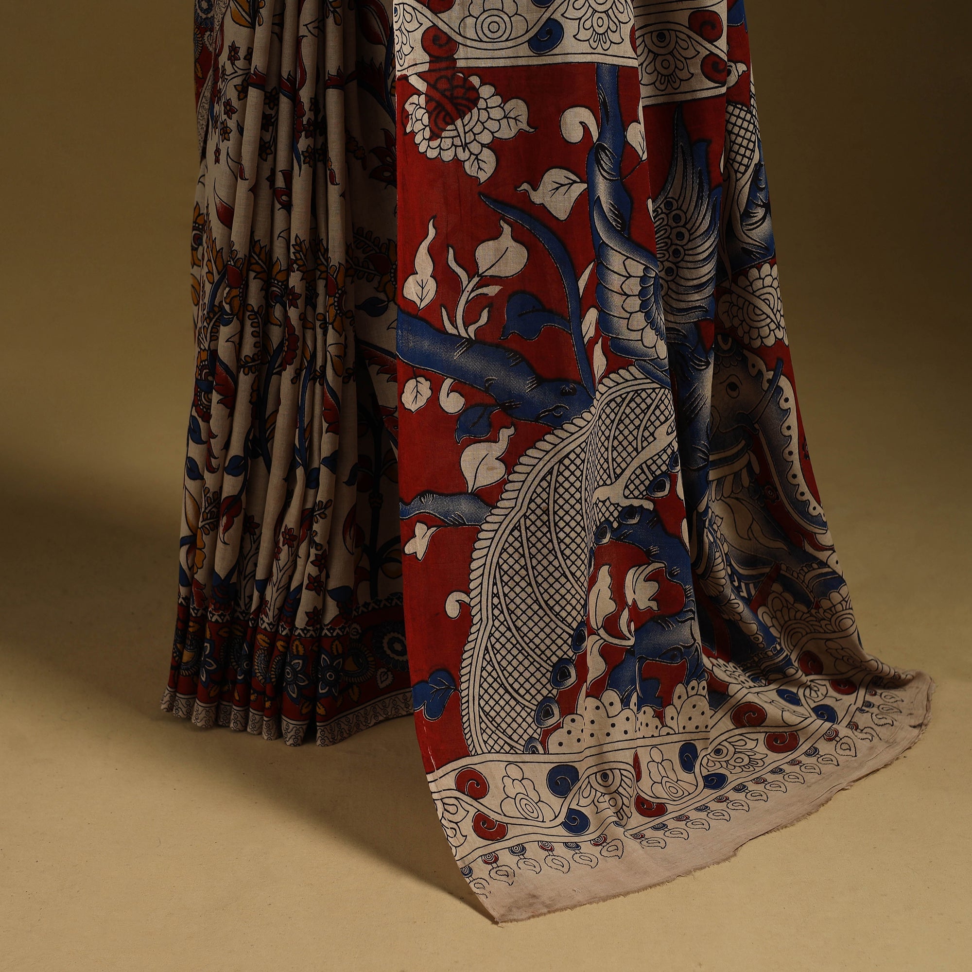 Pure cotton saree showcases the beauty of kalamkari art, admired for its intricate and storytelling motifs. Featuring screen-printed patterns inspired by florals, vines, figures and elephants, it carries a distinctive appeal, making it suitable for casual outings or daily wear.