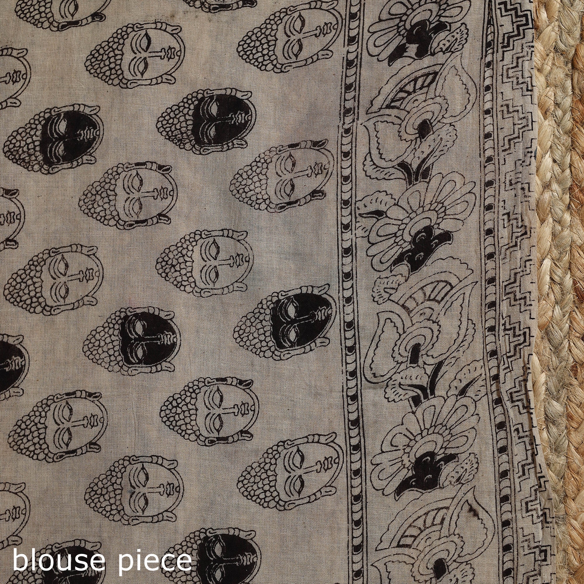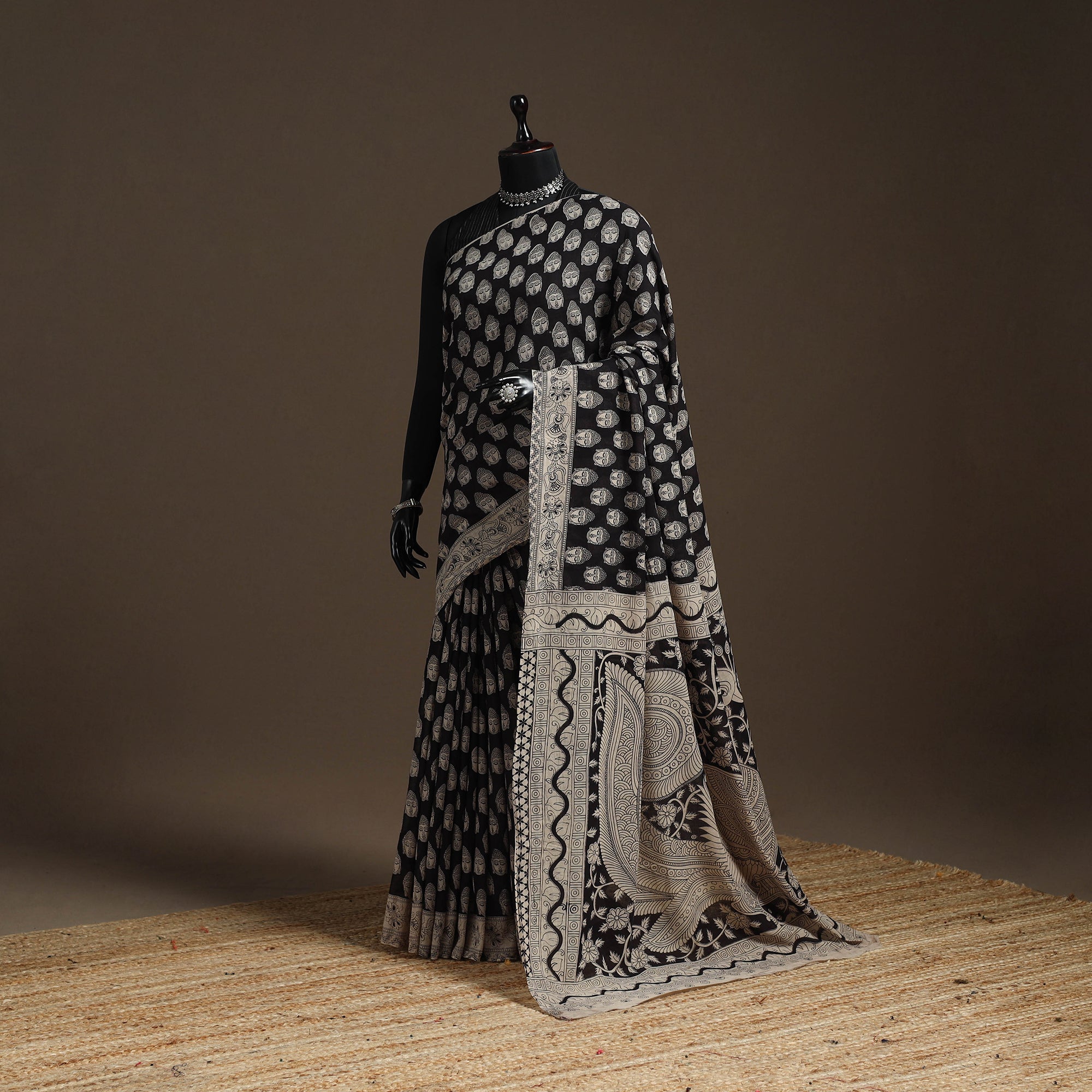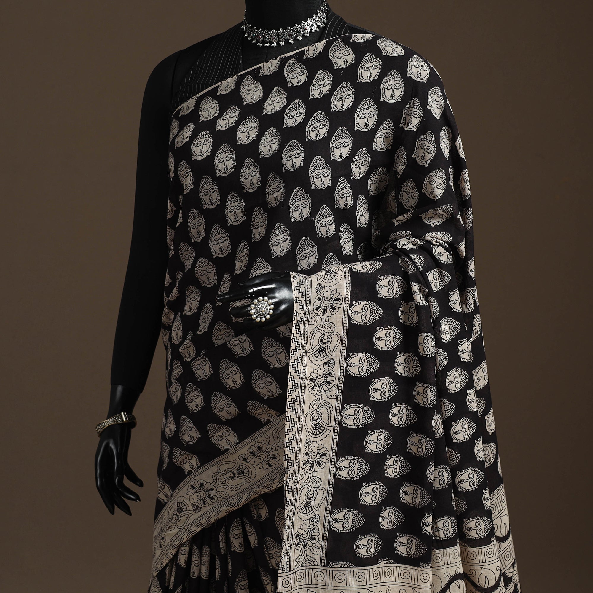 Black pure cotton saree showcases the beauty of kalamkari art, admired for its intricate and storytelling motifs. Featuring screen-printed patterns inspired by florals, vines, figures and elephants, it carries a distinctive appeal that makes it truly special. Crafted by skilled artisans, this saree blends traditional style with a modern look, making it suitable for festive gatherings or casual outings.
