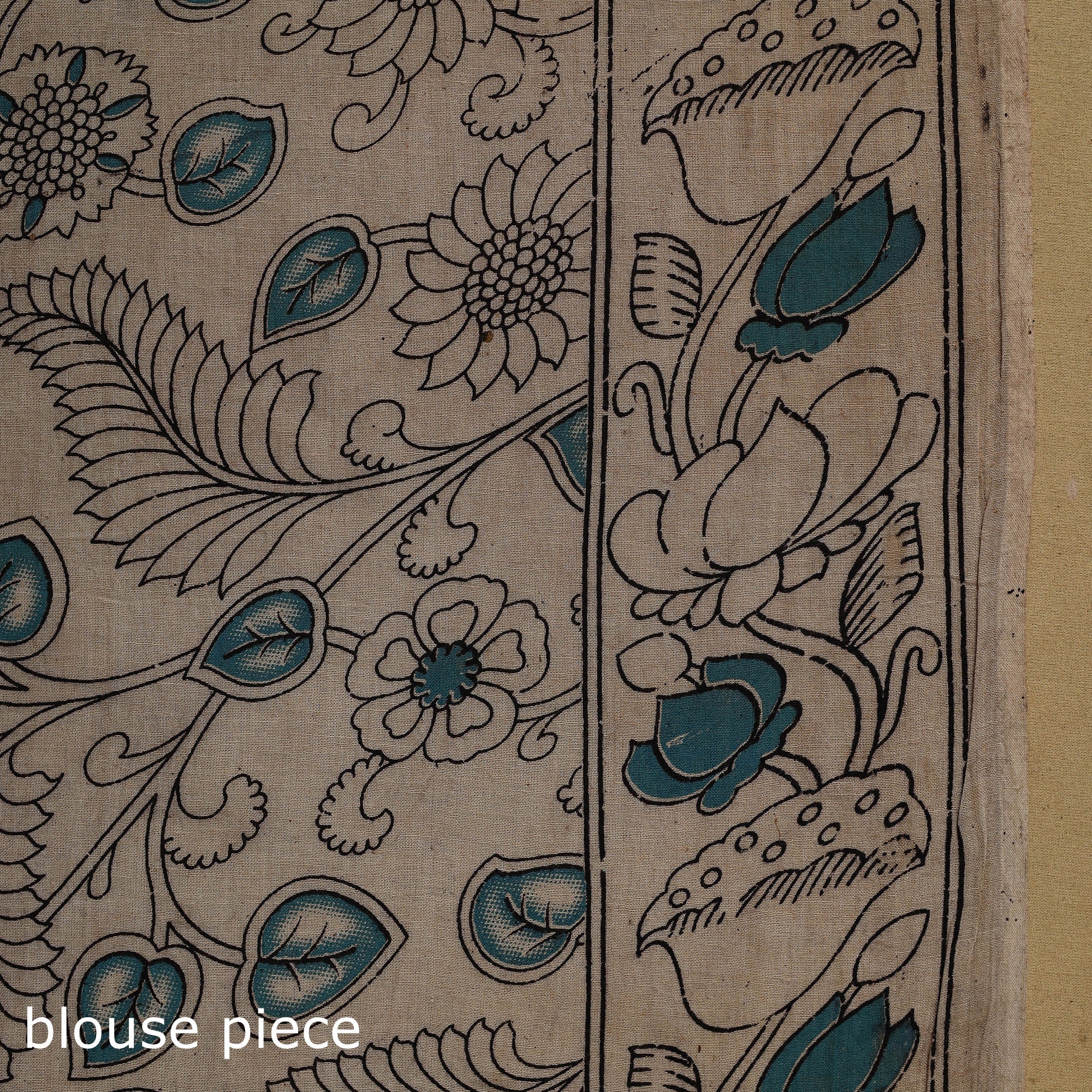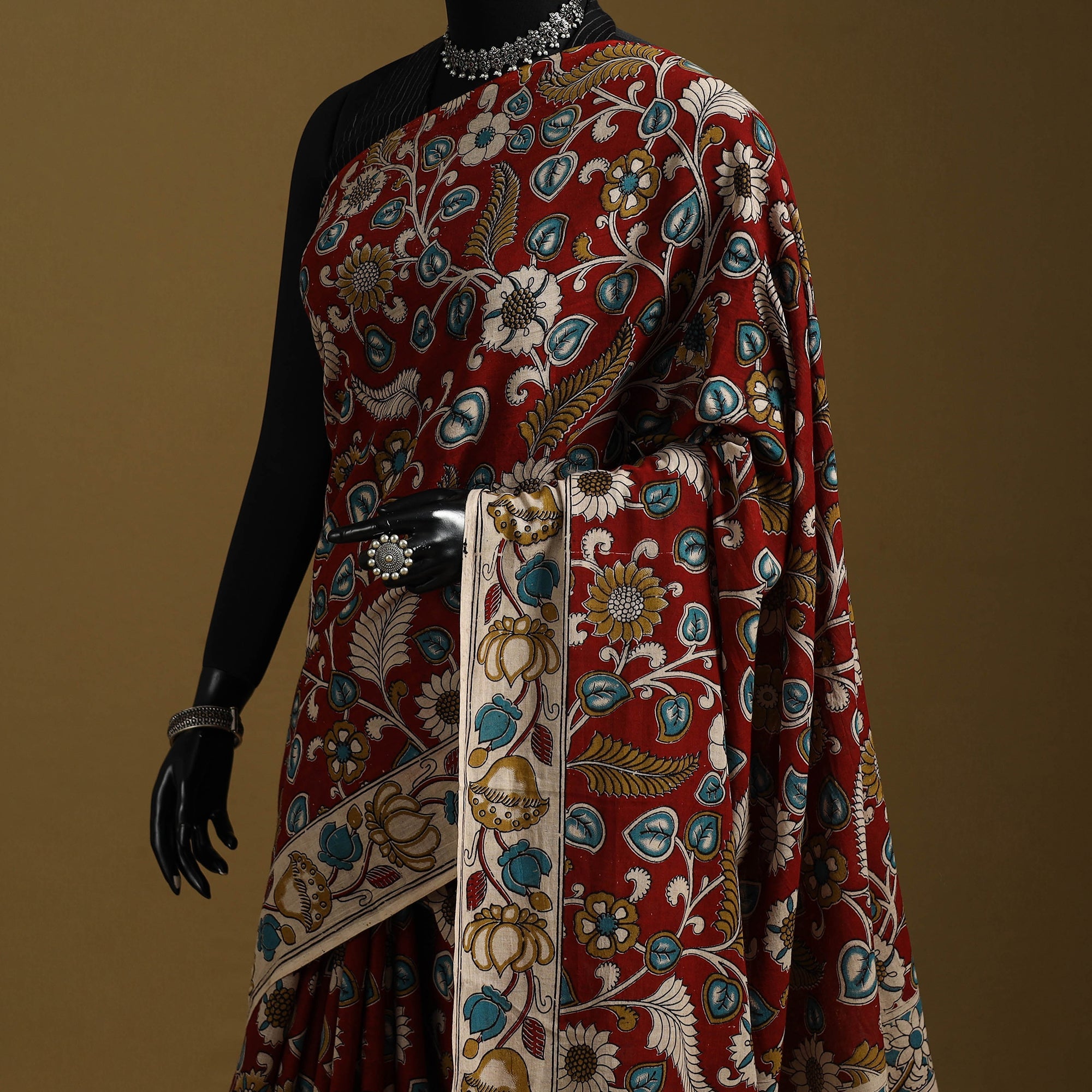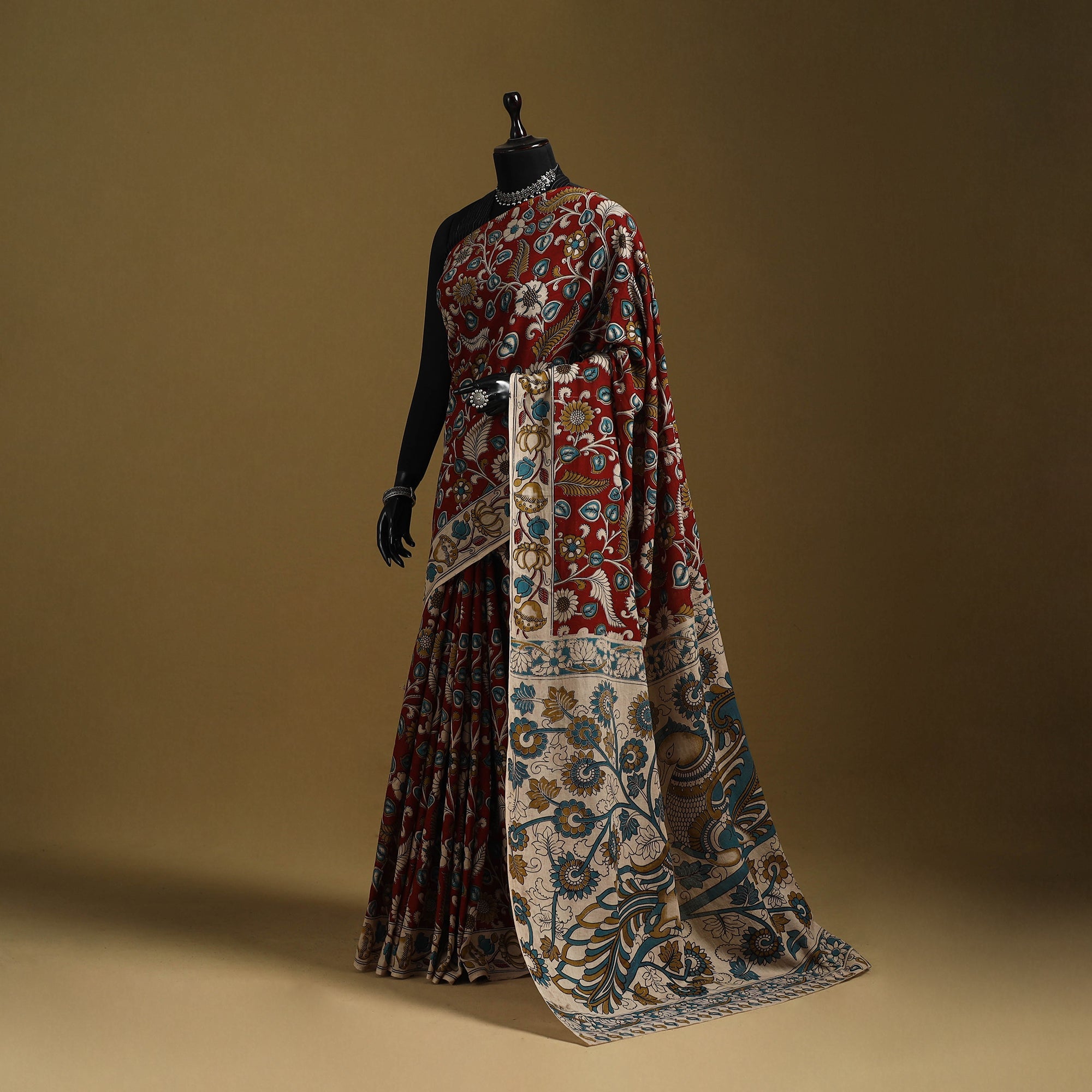 Pure cotton saree showcases the beauty of kalamkari art, admired for its intricate and storytelling motifs. Featuring screen-printed patterns inspired by florals, vines, figures and elephants, it carries a distinctive appeal, making it suitable for casual outings or daily wear.