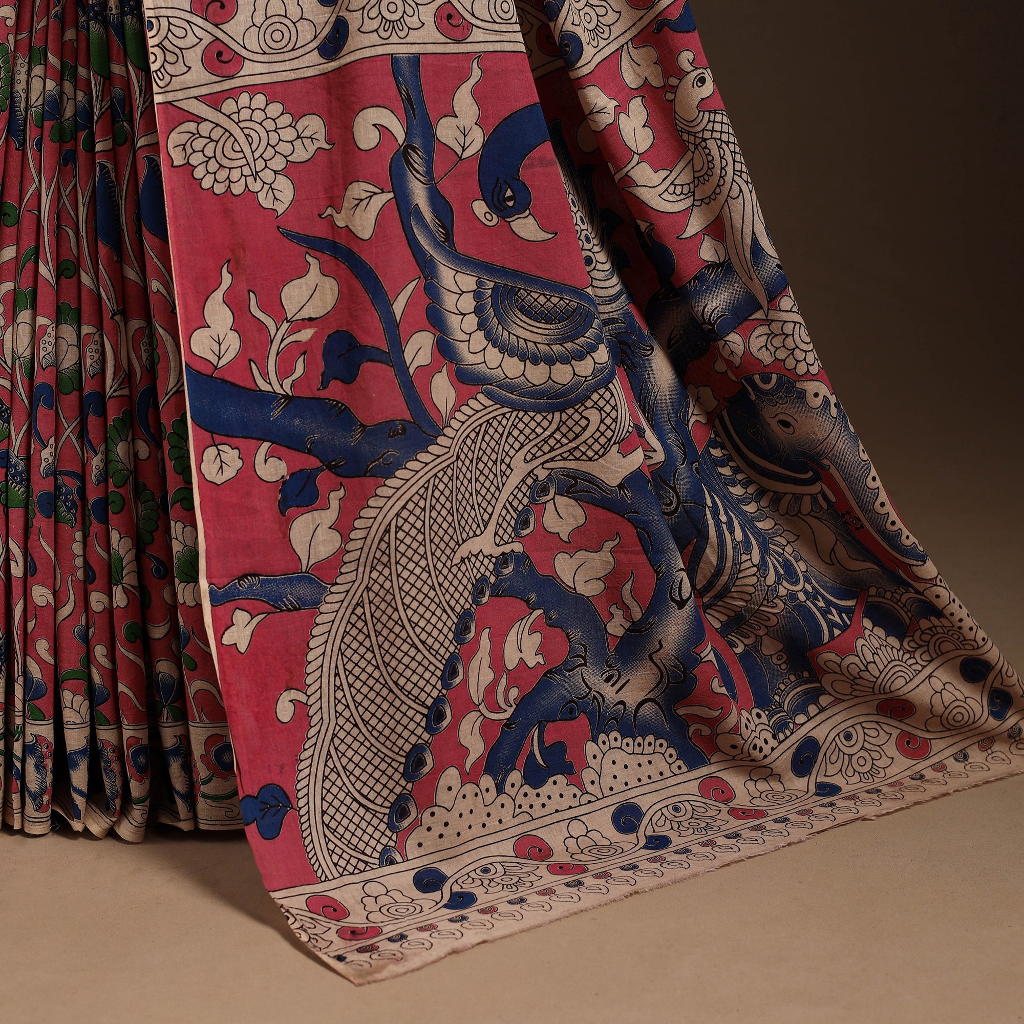 This pink pure cotton saree celebrates the beauty of kalamkari art, admired for its intricate and storytelling motifs. Featuring screen-printed patterns inspired by florals, vines, figures and elephants, it exudes a subtle elegance that makes it truly special. Crafted by skilled artisans this saree beautifully blends tradition with modern grace, making it perfect for festive gatherings or casual outings.