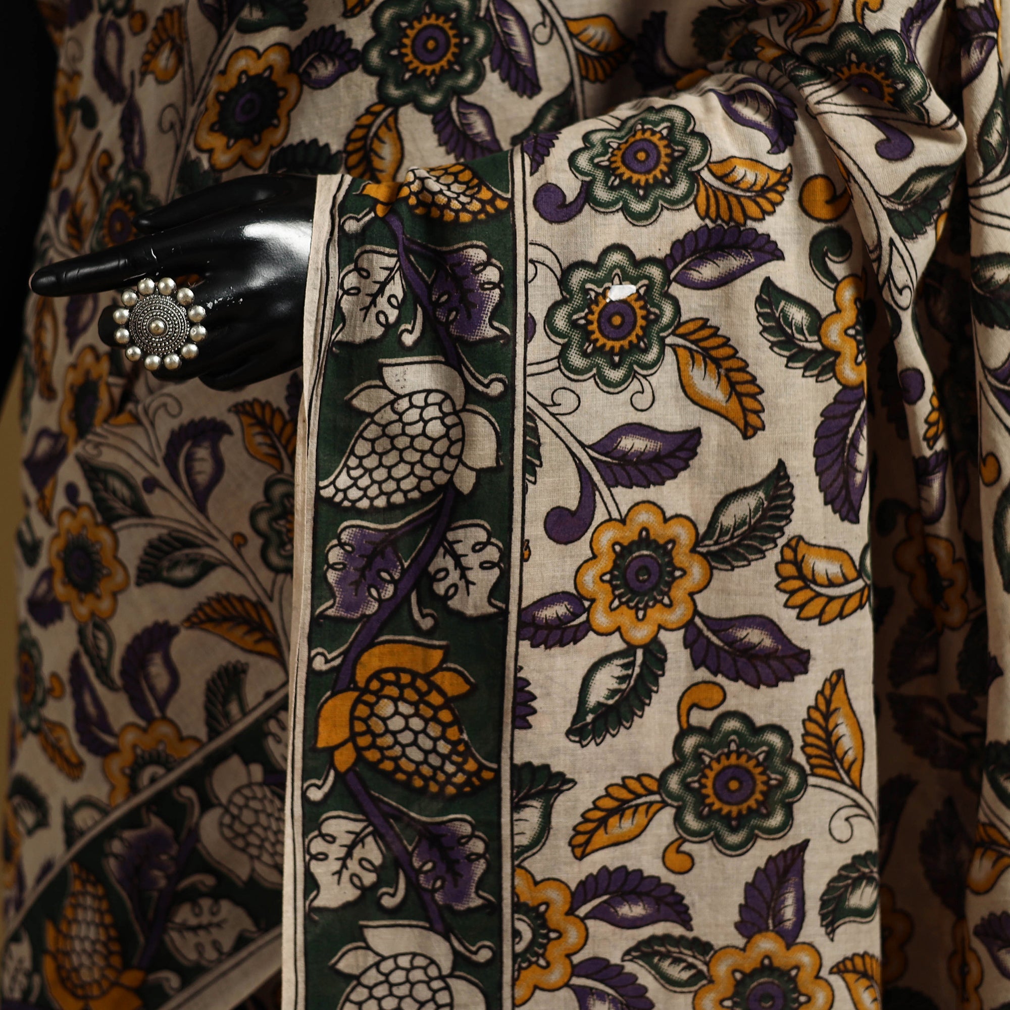 Pure cotton saree showcases the beauty of kalamkari art, admired for its intricate and storytelling motifs. Featuring screen-printed patterns inspired by florals, vines, figures and elephants, it carries a distinctive appeal, making it suitable for casual outings or daily wear.