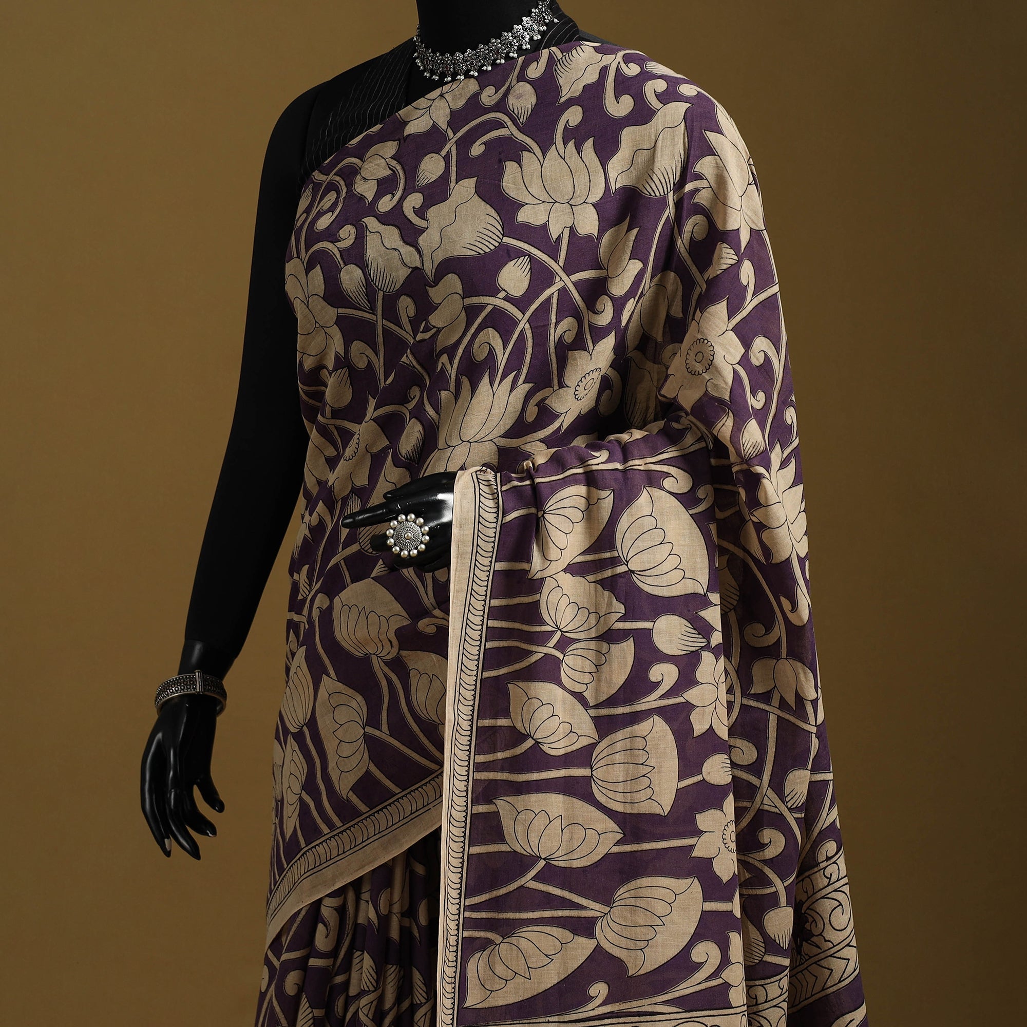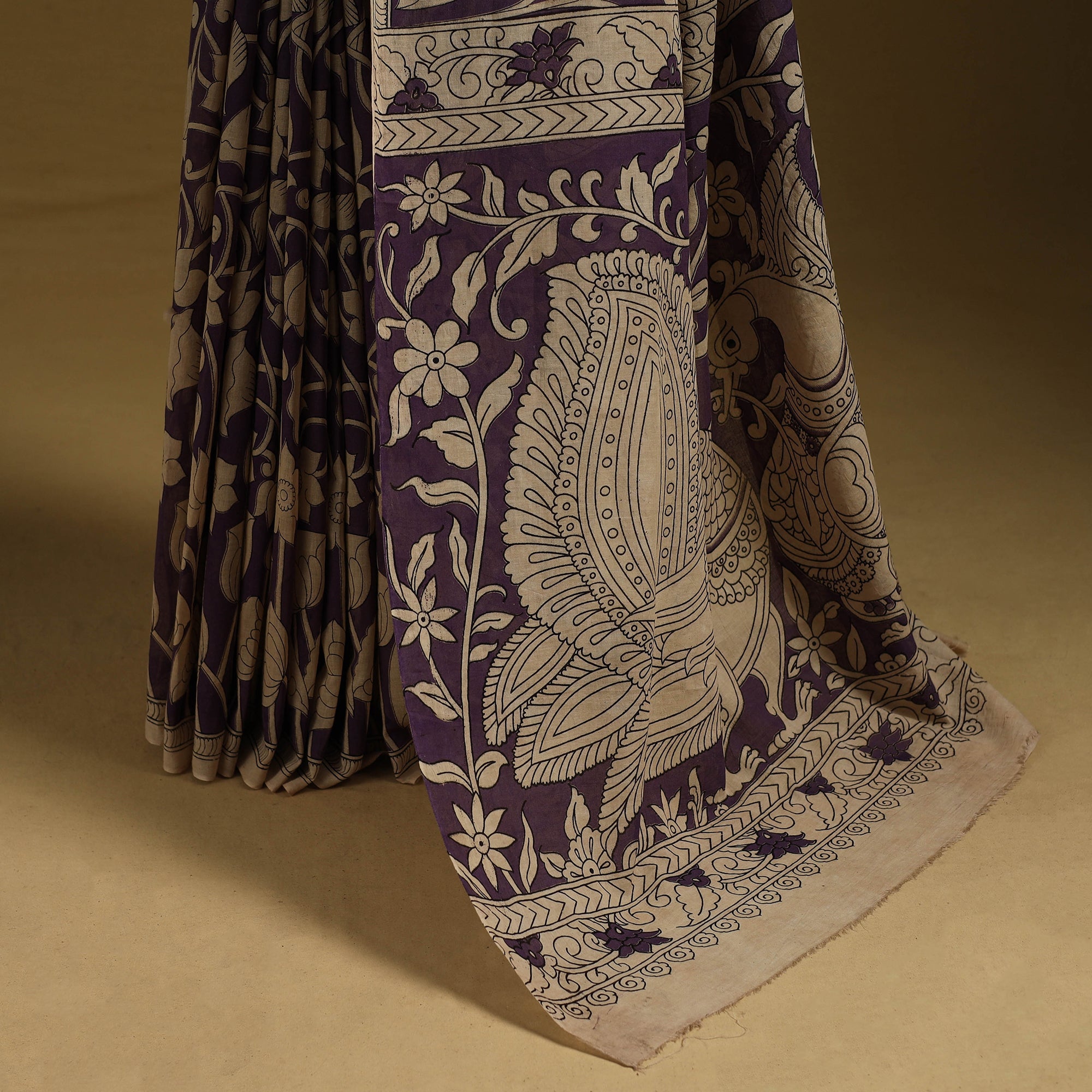 Pure cotton saree showcases the beauty of kalamkari art, admired for its intricate and storytelling motifs. Featuring screen-printed patterns inspired by florals, vines, figures and elephants, it carries a distinctive appeal, making it suitable for casual outings or daily wear.