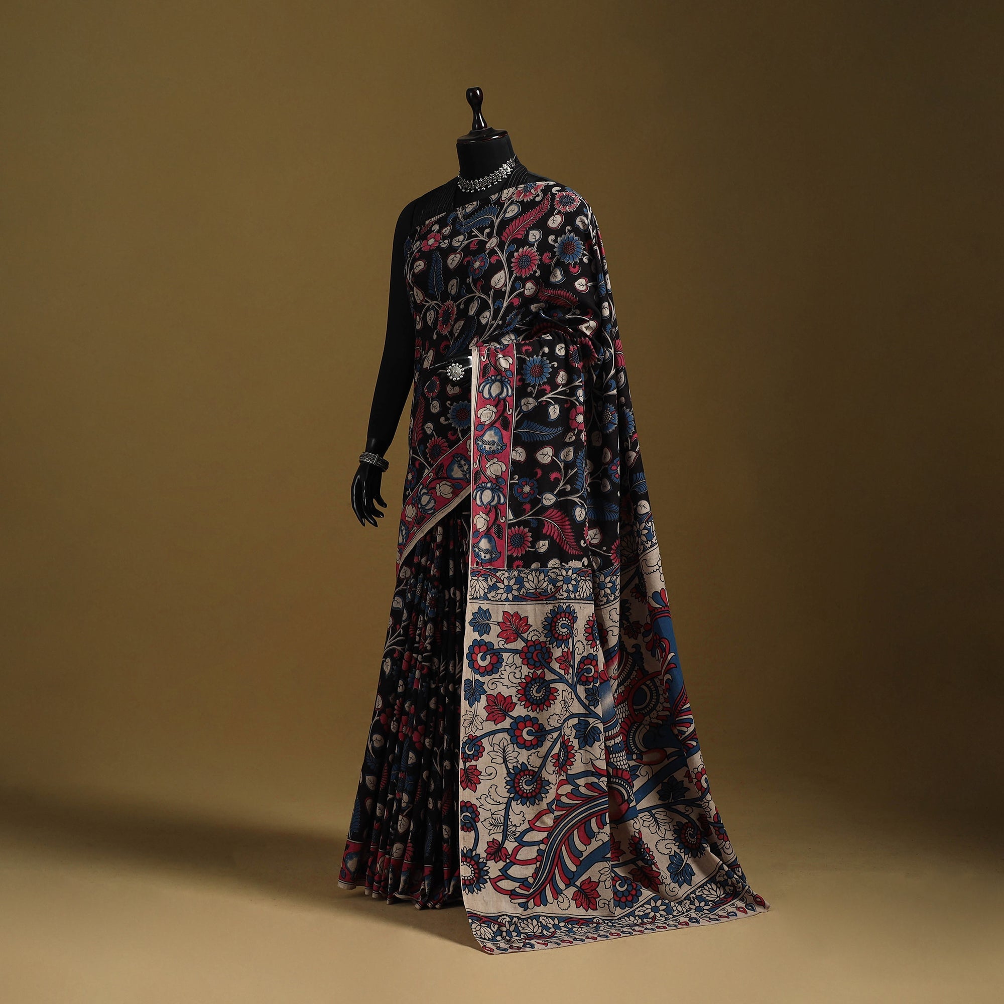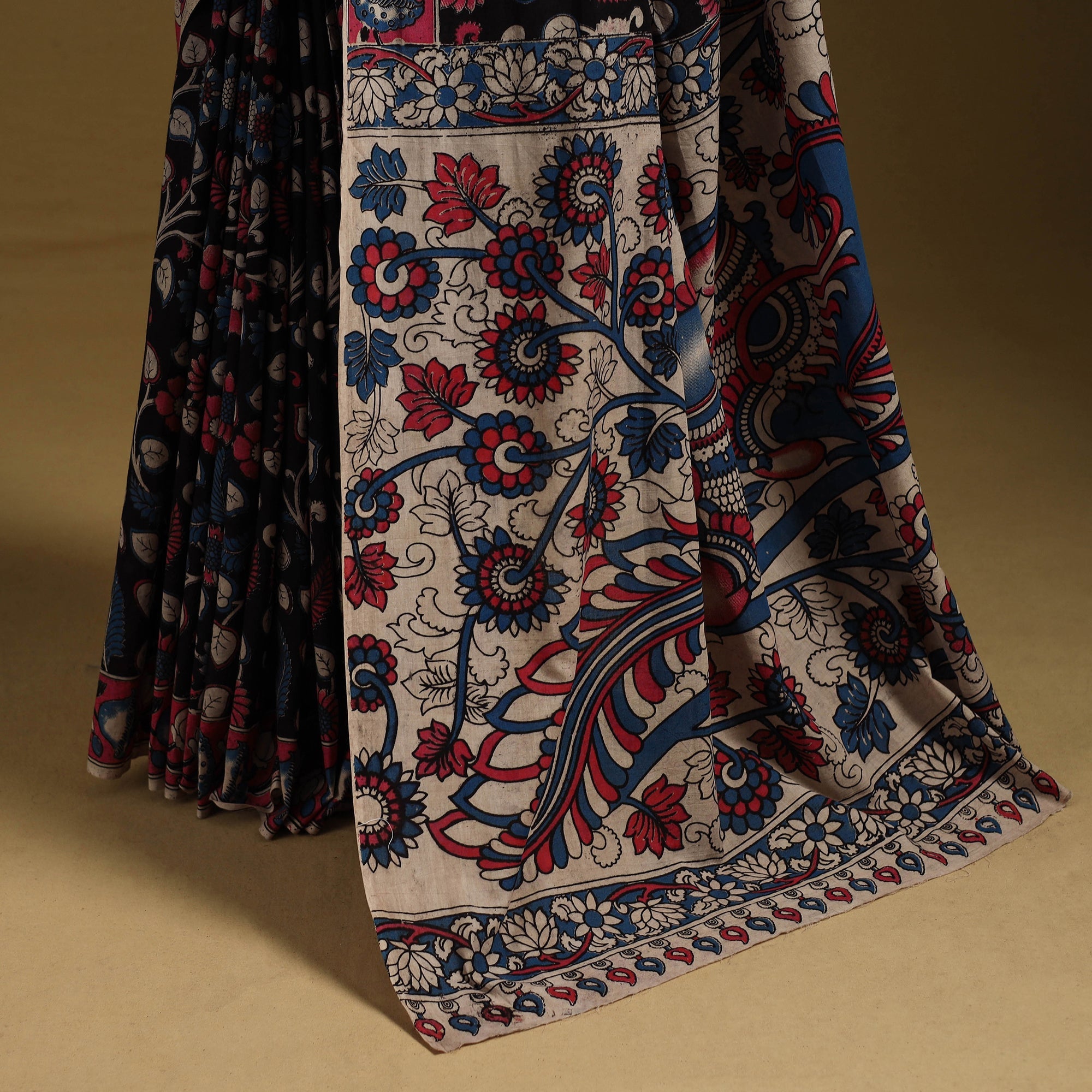 Black pure cotton saree showcases the beauty of kalamkari art, admired for its intricate and storytelling motifs. Featuring screen-printed patterns inspired by florals, vines, figures and elephants, it carries a distinctive appeal, making it suitable for casual outings or daily wear.
