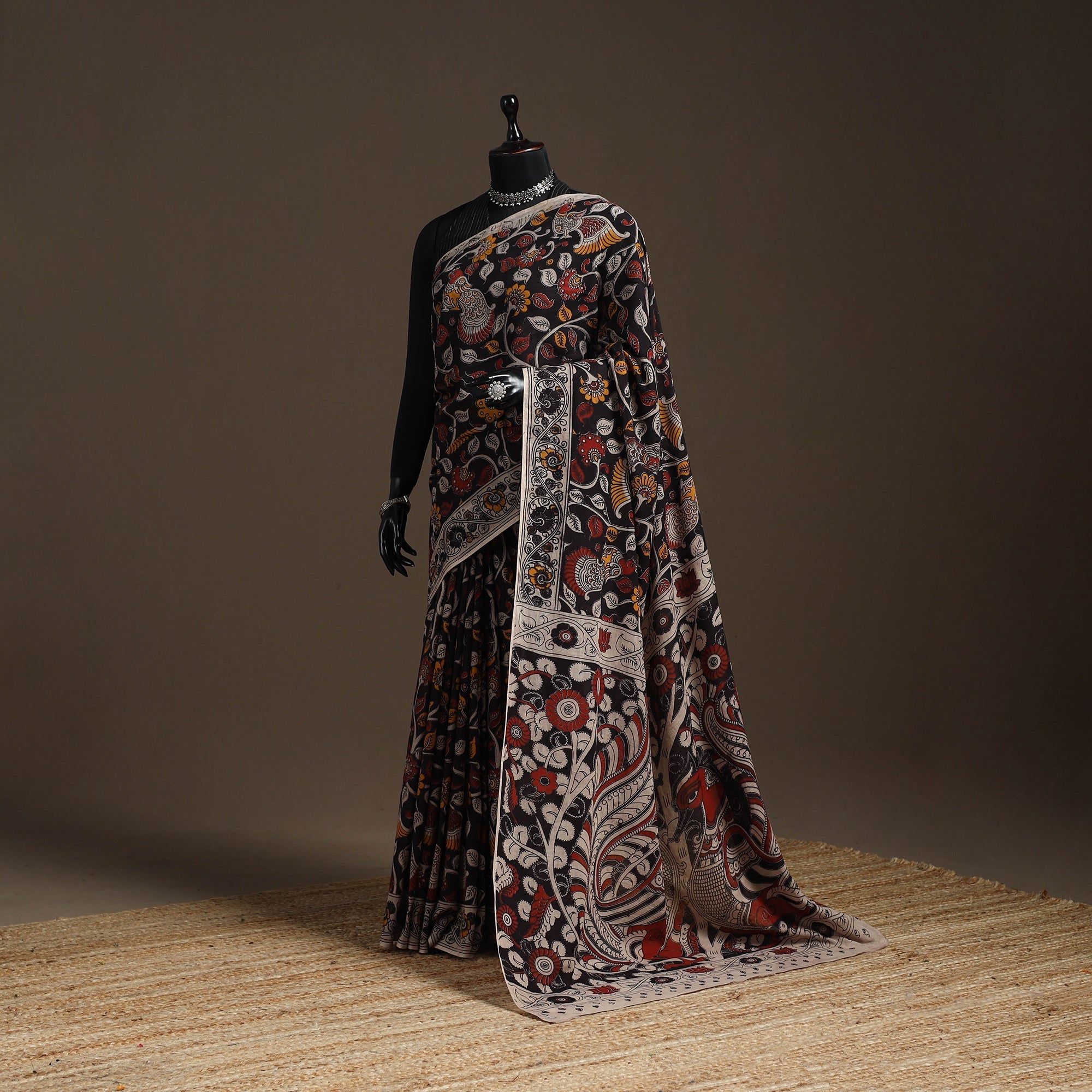 Black pure cotton saree showcases the beauty of kalamkari art, admired for its intricate and storytelling motifs. Featuring screen-printed patterns inspired by florals, vines, figures and elephants, it carries a distinctive appeal that makes it truly special. Crafted by skilled artisans, this saree blends traditional style with a modern look, making it suitable for festive gatherings or casual outings.