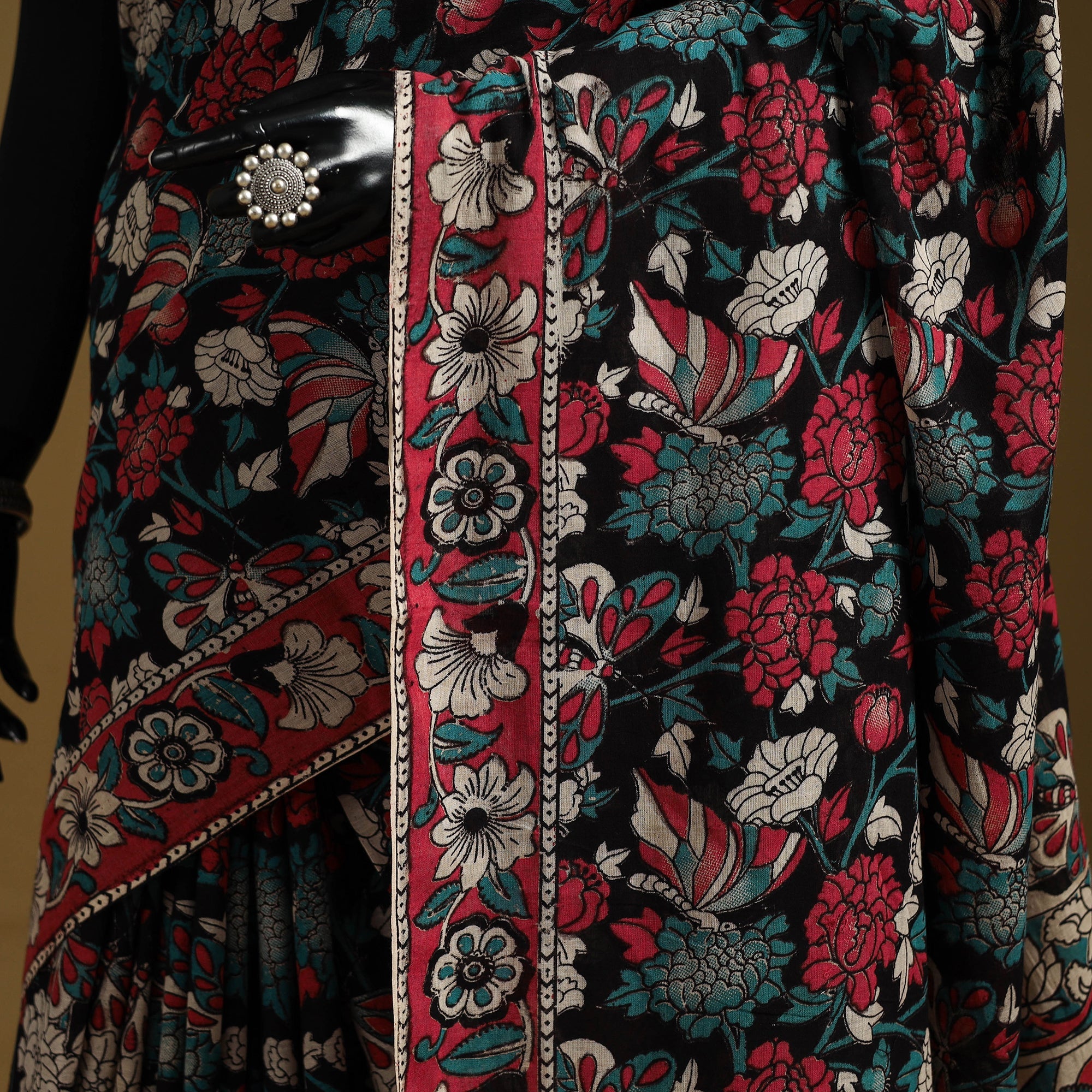 Black pure cotton saree showcases the beauty of kalamkari art, admired for its intricate and storytelling motifs. Featuring screen-printed patterns inspired by florals, vines, figures and elephants, it carries a distinctive appeal, making it suitable for casual outings or daily wear.