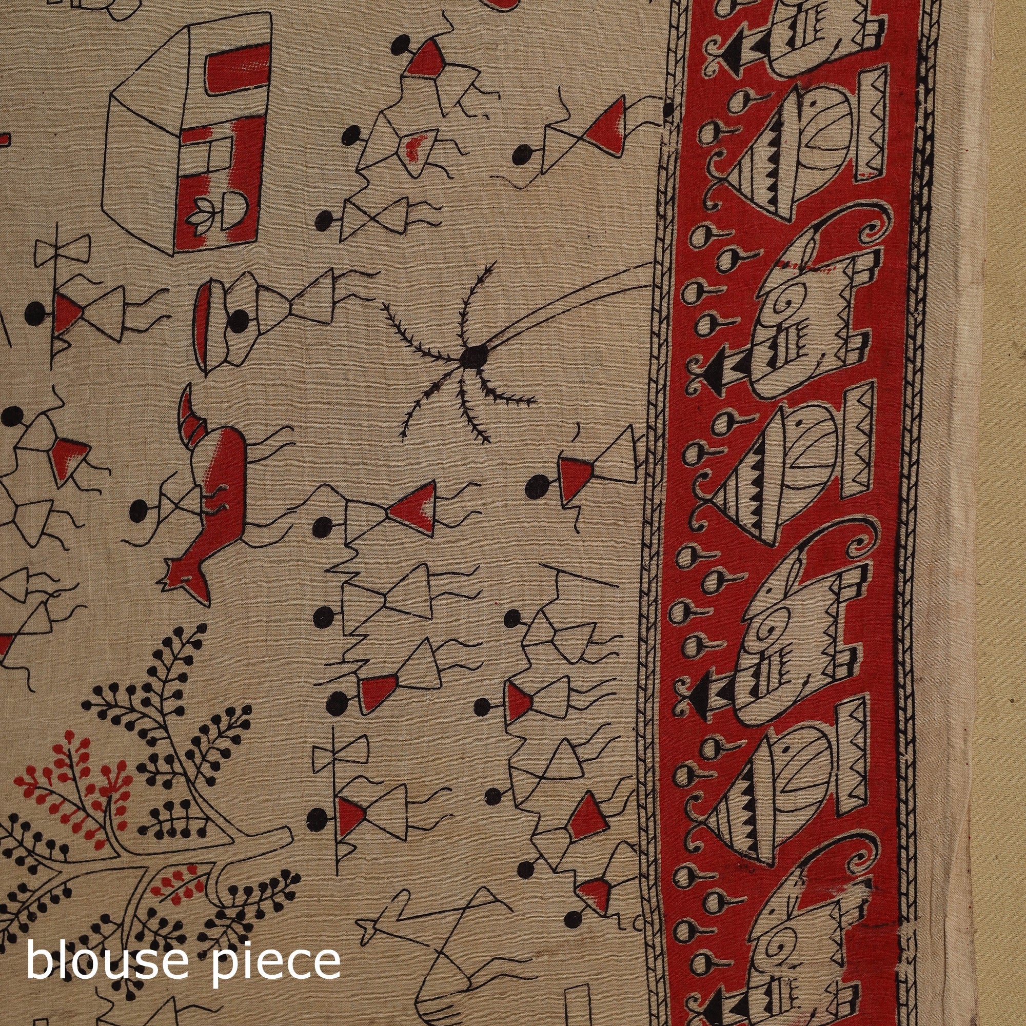 Pure cotton saree showcases the beauty of kalamkari art, admired for its intricate and storytelling motifs. Featuring screen-printed patterns inspired by florals, vines, figures and elephants, it carries a distinctive appeal, making it suitable for casual outings or daily wear.