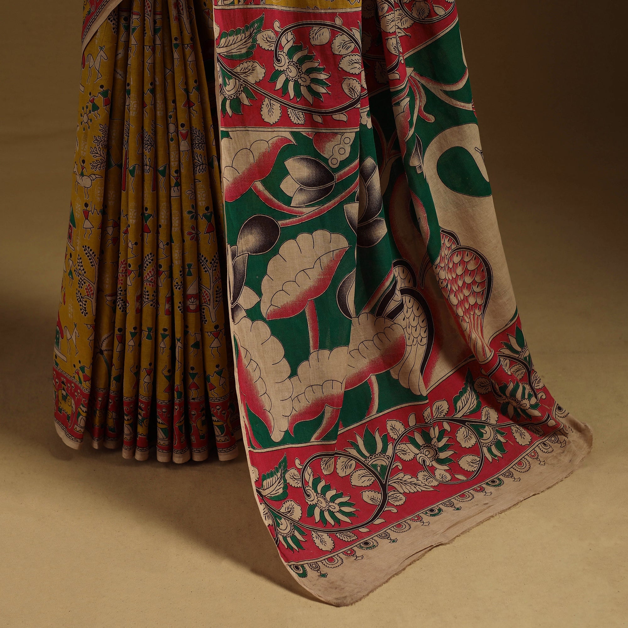 Pure cotton saree showcases the beauty of kalamkari art, admired for its intricate and storytelling motifs. Featuring screen-printed patterns inspired by florals, vines, figures and elephants, it carries a distinctive appeal, making it suitable for casual outings or daily wear.