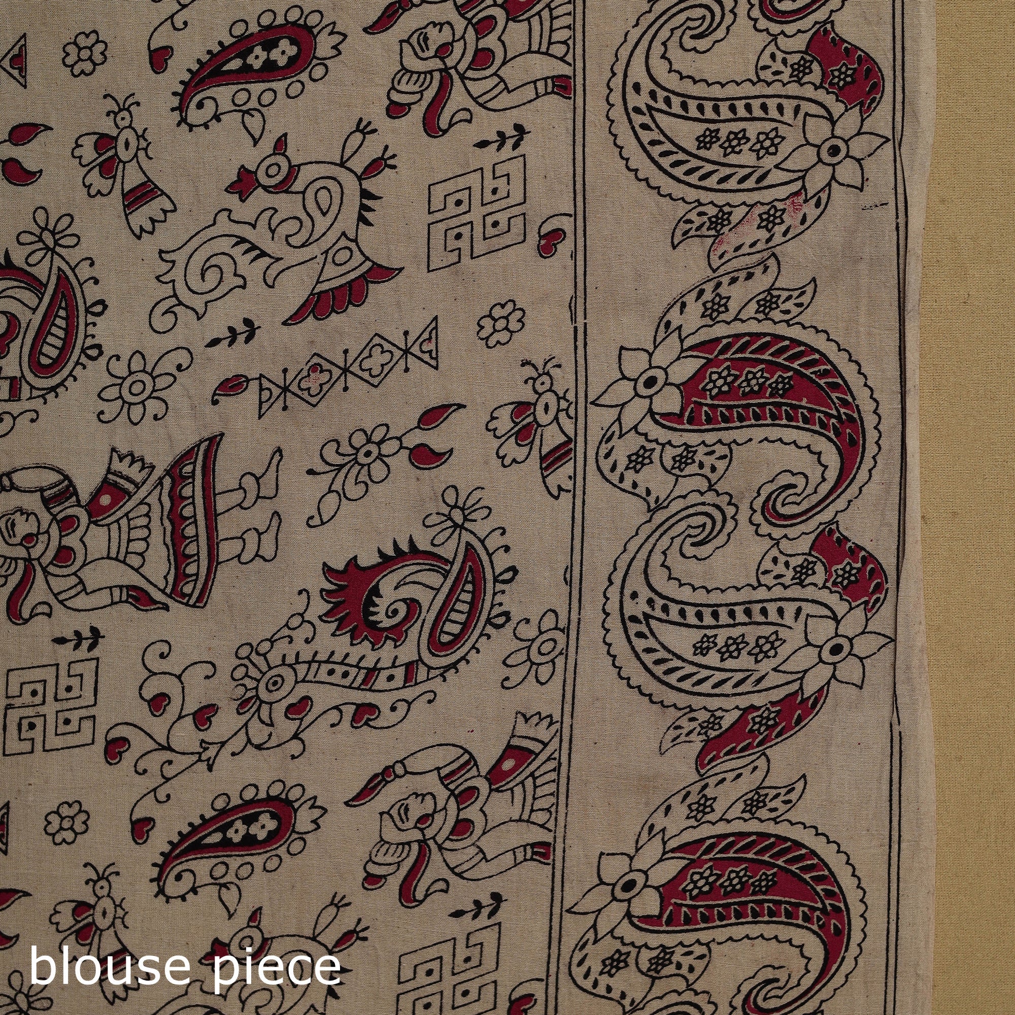| Material | Blue pure cotton saree showcases the beauty of kalamkari art, admired for its intricate and storytelling motifs. Featuring screen-printed patterns inspired by florals, vines, figures and elephants, it carries a distinctive appeal, making it suitable for casual outings or daily wear. |