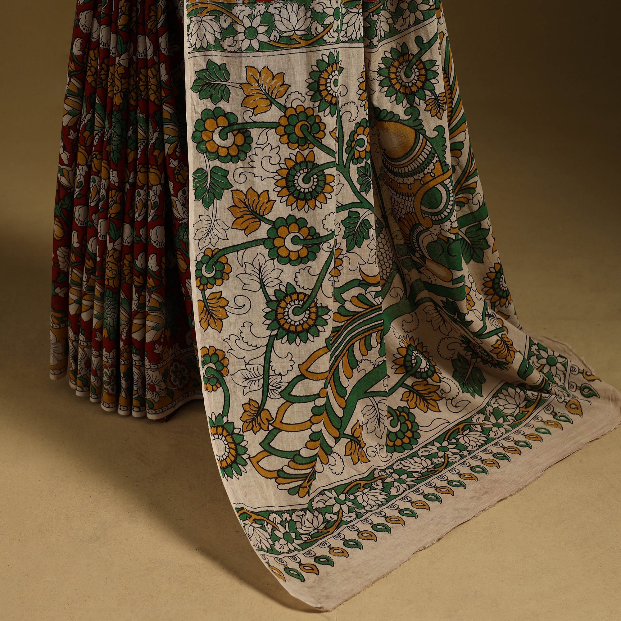 | Material | Red pure cotton saree showcases the beauty of kalamkari art, admired for its intricate and storytelling motifs. Featuring screen-printed patterns inspired by florals, vines, figures and elephants, it carries a distinctive appeal, making it suitable for casual outings or daily wear. |