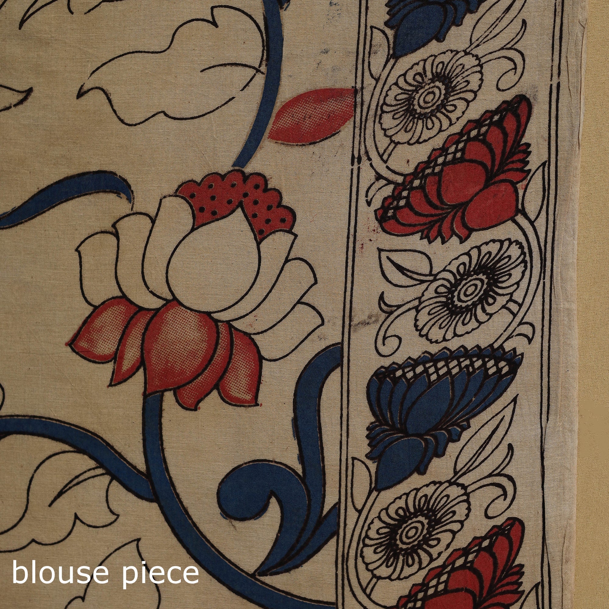 Pure cotton saree showcases the beauty of kalamkari art, admired for its intricate and storytelling motifs. Featuring screen-printed patterns inspired by florals, vines, figures and elephants, it carries a distinctive appeal, making it suitable for casual outings or daily wear.