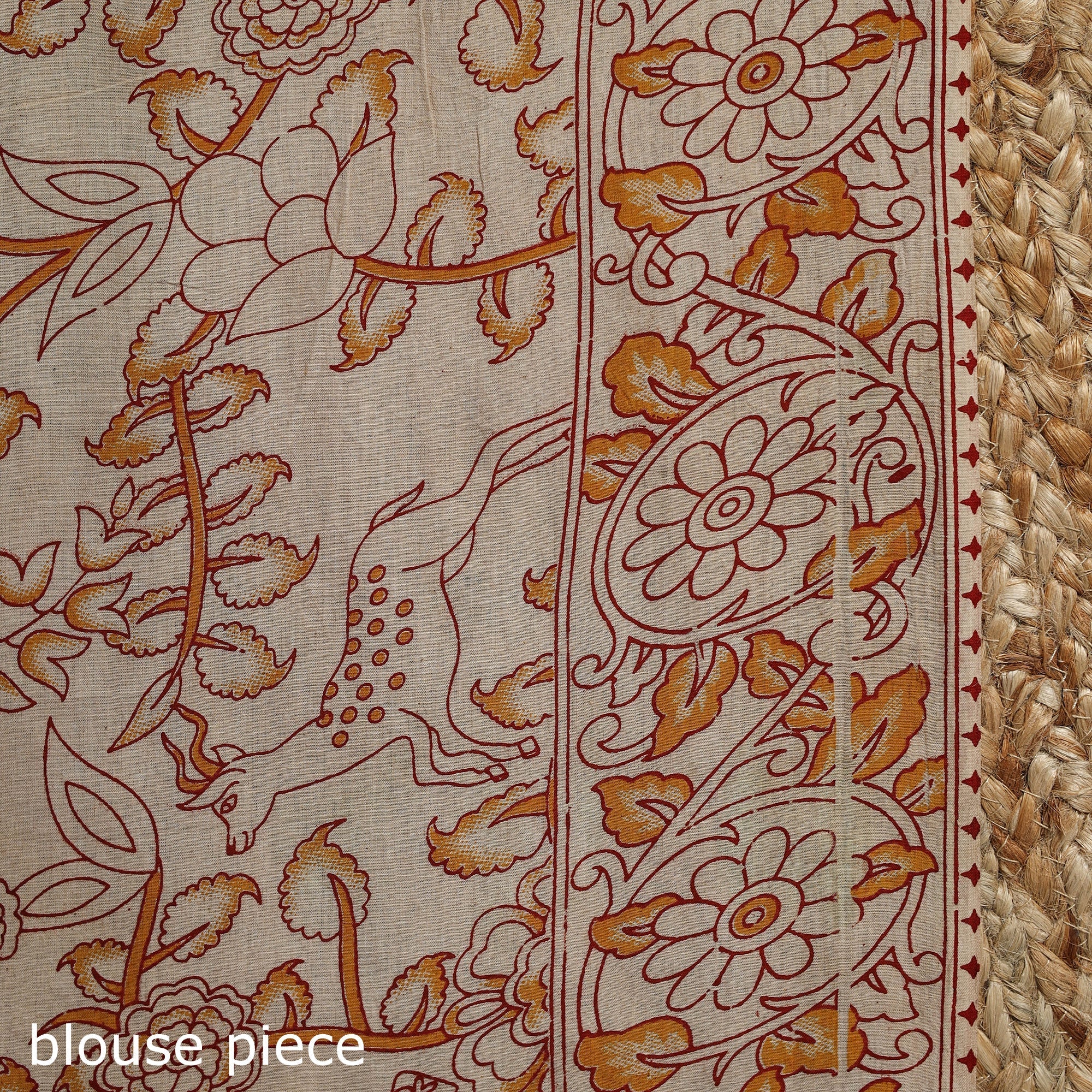 Yellow pure cotton saree showcases the beauty of kalamkari art, admired for its intricate and storytelling motifs. Featuring screen-printed patterns inspired by florals, vines, figures and elephants, it carries a distinctive appeal that makes it truly special. Crafted by skilled artisans, this saree blends traditional style with a modern look, making it suitable for festive gatherings or casual outings.