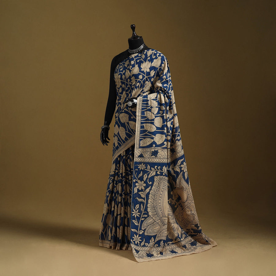 | Material | Blue pure cotton saree showcases the beauty of kalamkari art, admired for its intricate and storytelling motifs. Featuring screen-printed patterns inspired by florals, vines, figures and elephants, it carries a distinctive appeal, making it suitable for casual outings or daily wear. |