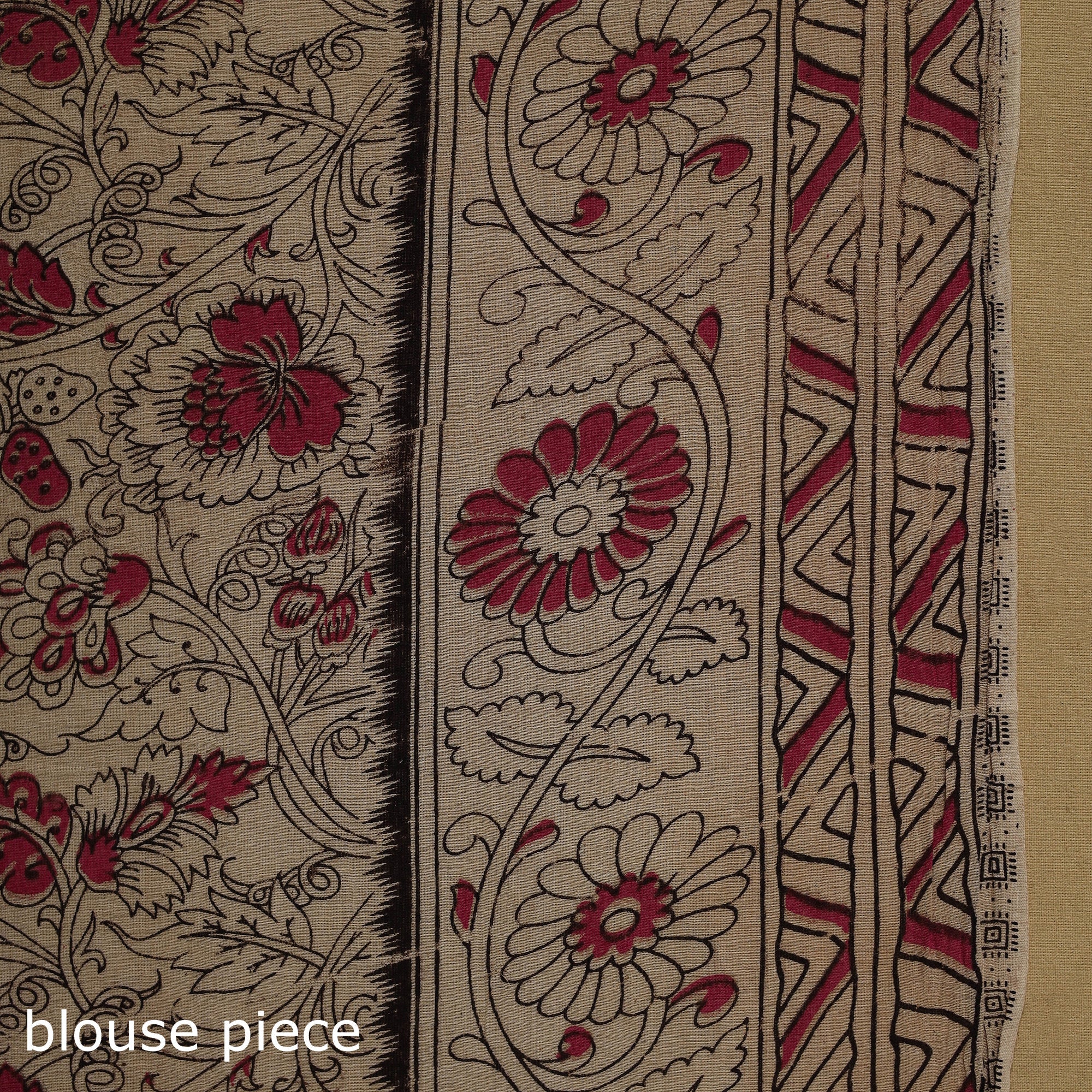 Pure cotton saree showcases the beauty of kalamkari art, admired for its intricate and storytelling motifs. Featuring screen-printed patterns inspired by florals, vines, figures and elephants, it carries a distinctive appeal, making it suitable for casual outings or daily wear.