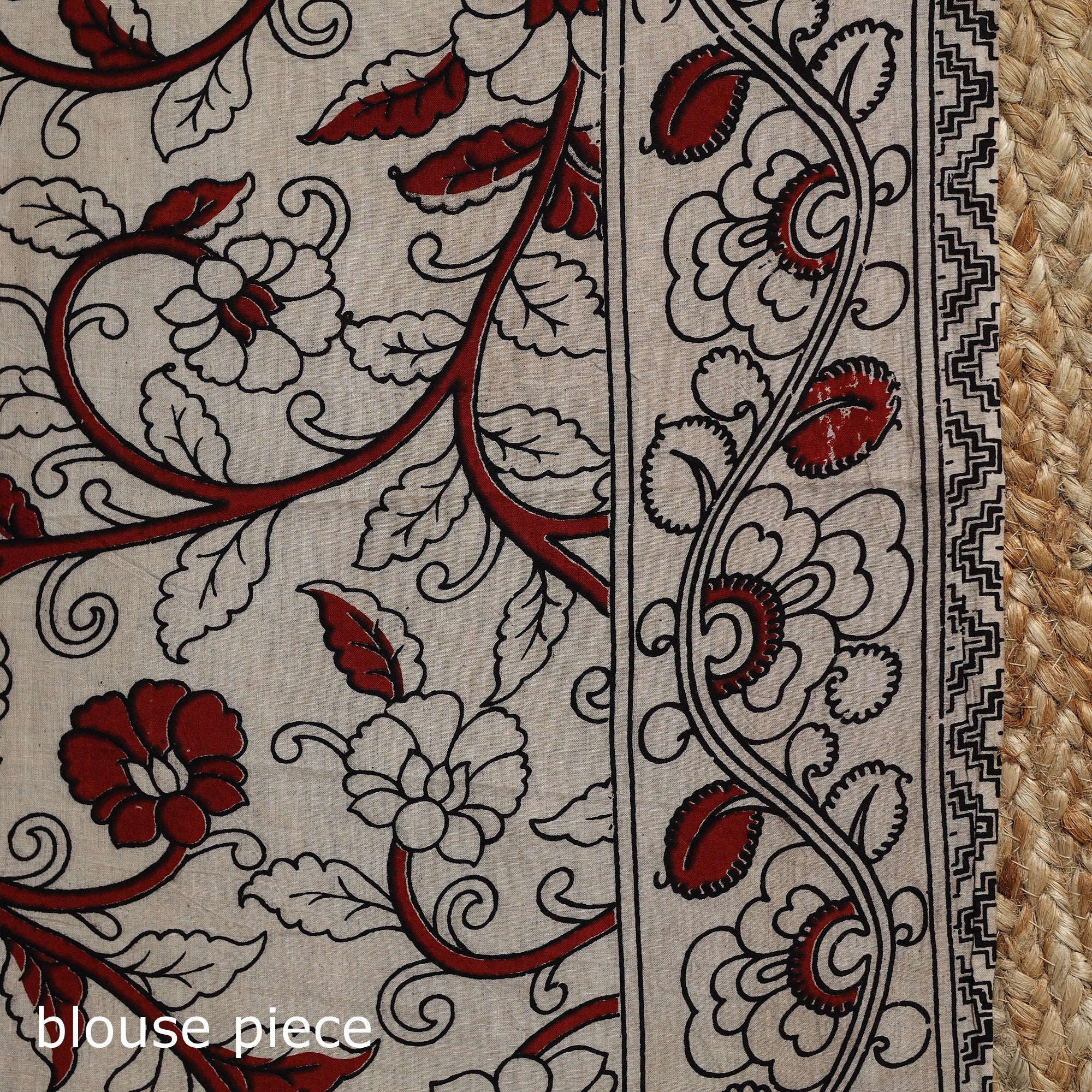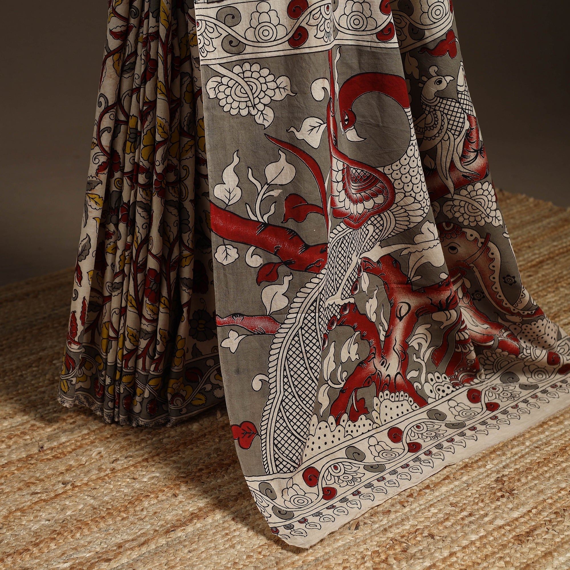 Beige pure cotton saree showcases the beauty of kalamkari art, admired for its intricate and storytelling motifs. Featuring screen-printed patterns inspired by florals, vines, figures and elephants, it carries a distinctive appeal that makes it truly special. Crafted by skilled artisans, this saree blends traditional style with a modern look, making it suitable for festive gatherings or casual outings.