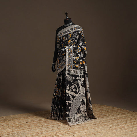 Black pure cotton saree showcases the beauty of kalamkari art, admired for its intricate and storytelling motifs. Featuring screen-printed patterns inspired by florals, vines, figures and elephants, it carries a distinctive appeal that makes it truly special. Crafted by skilled artisans, this saree blends traditional style with a modern look, making it suitable for festive gatherings or casual outings.