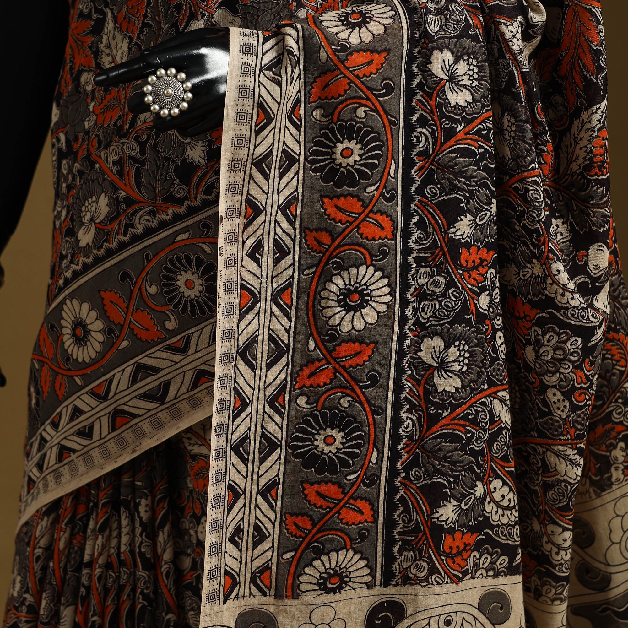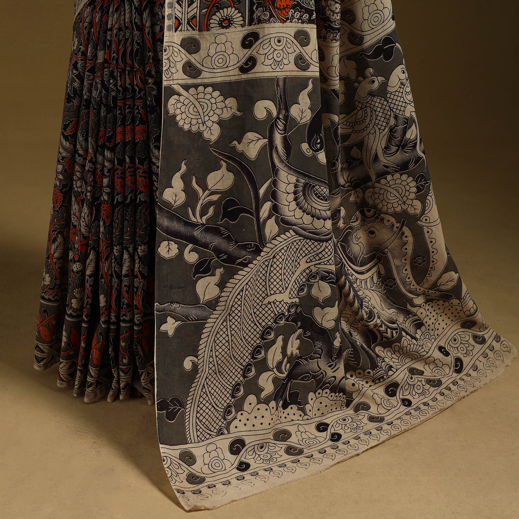 Black pure cotton saree showcases the beauty of kalamkari art, admired for its intricate and storytelling motifs. Featuring screen-printed patterns inspired by florals, vines, figures and elephants, it carries a distinctive appeal, making it suitable for casual outings or daily wear.