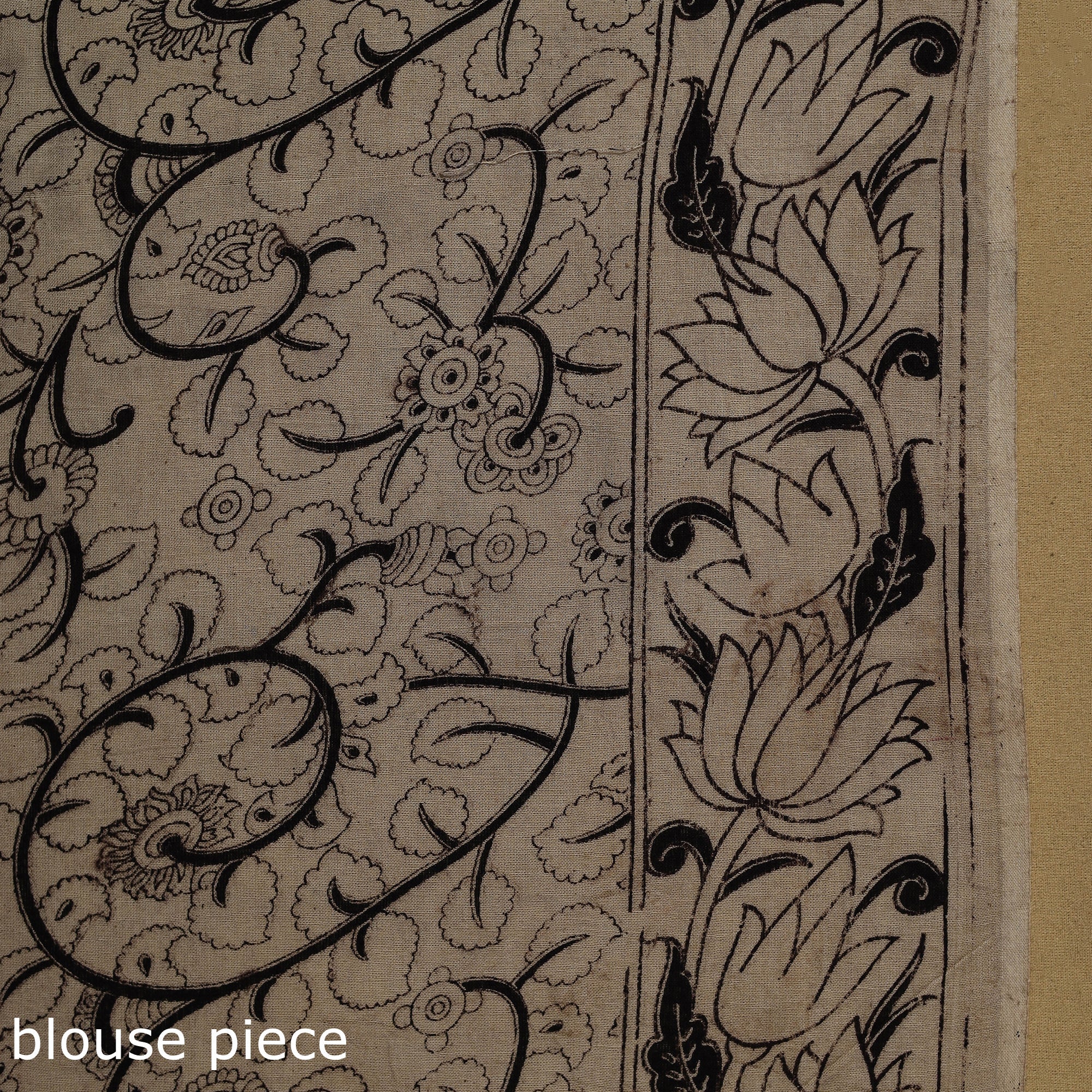 Pure cotton saree showcases the beauty of kalamkari art, admired for its intricate and storytelling motifs. Featuring screen-printed patterns inspired by florals, vines, figures and elephants, it carries a distinctive appeal, making it suitable for casual outings or daily wear.