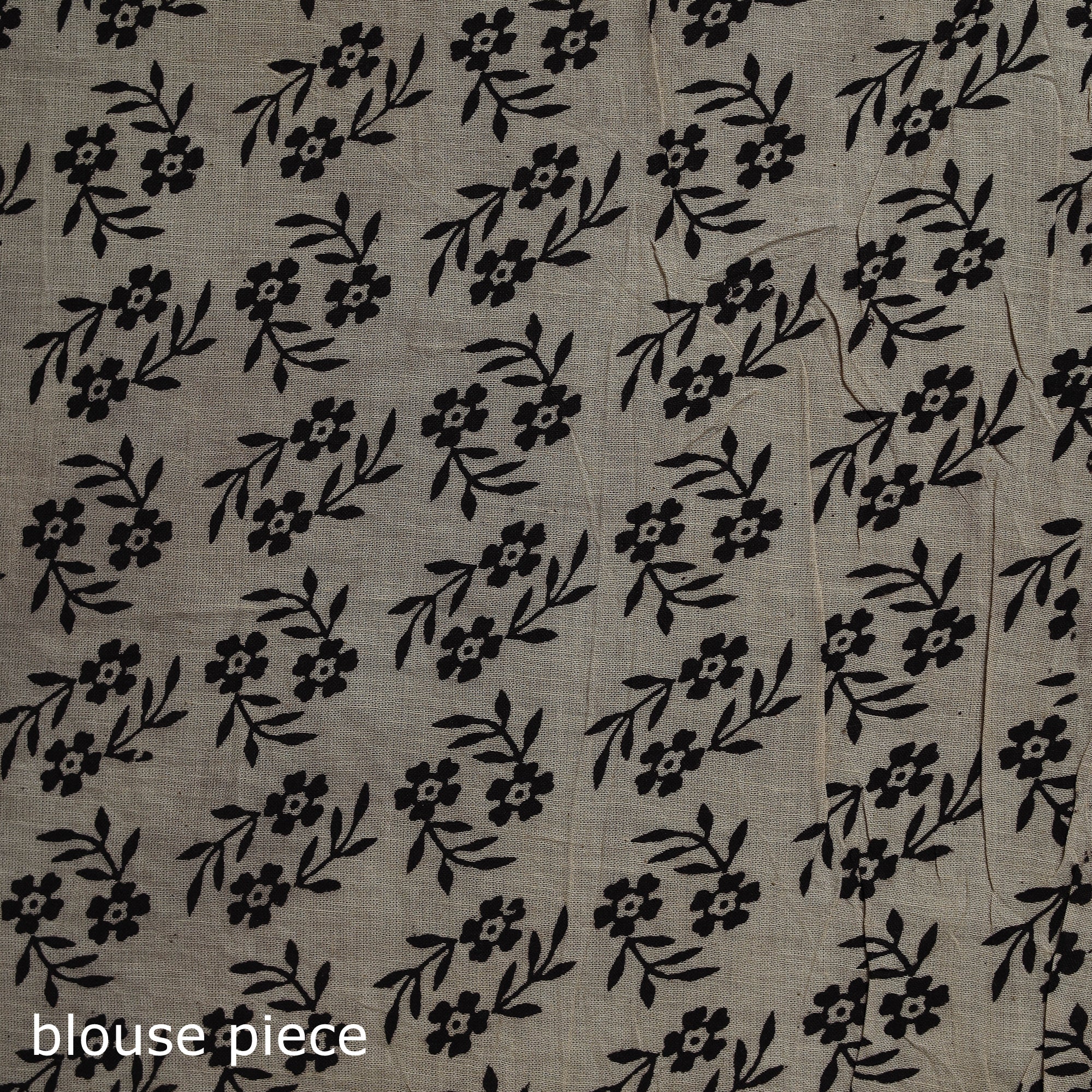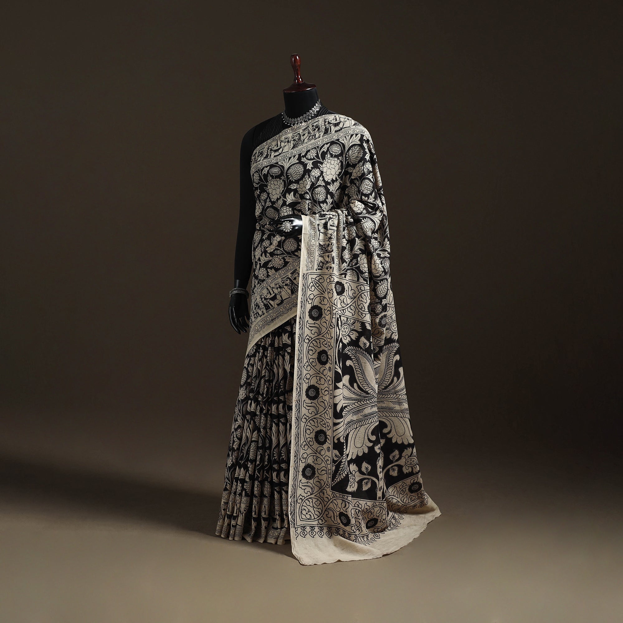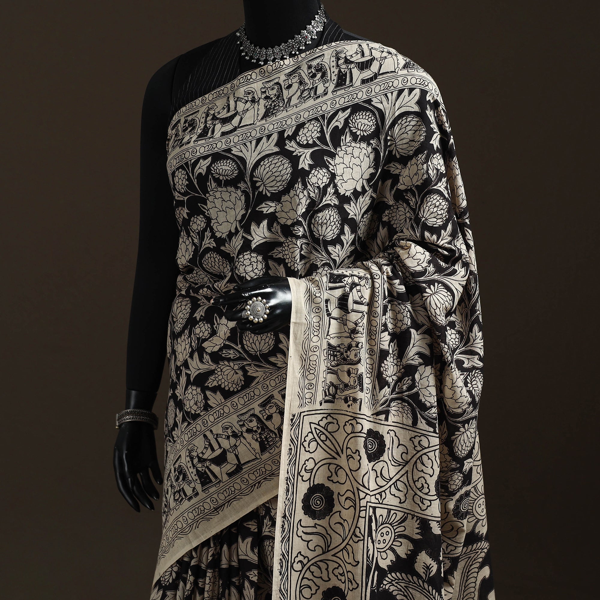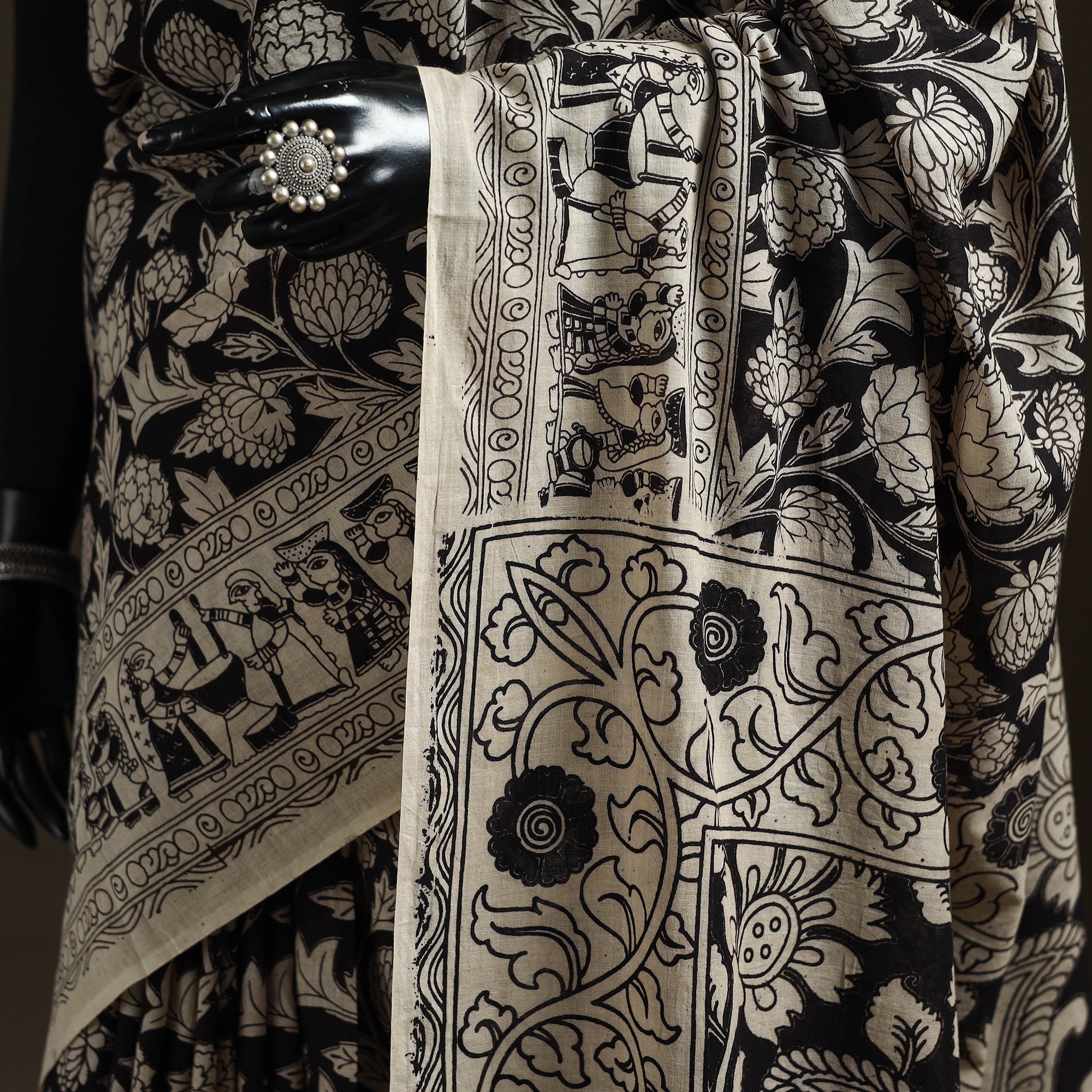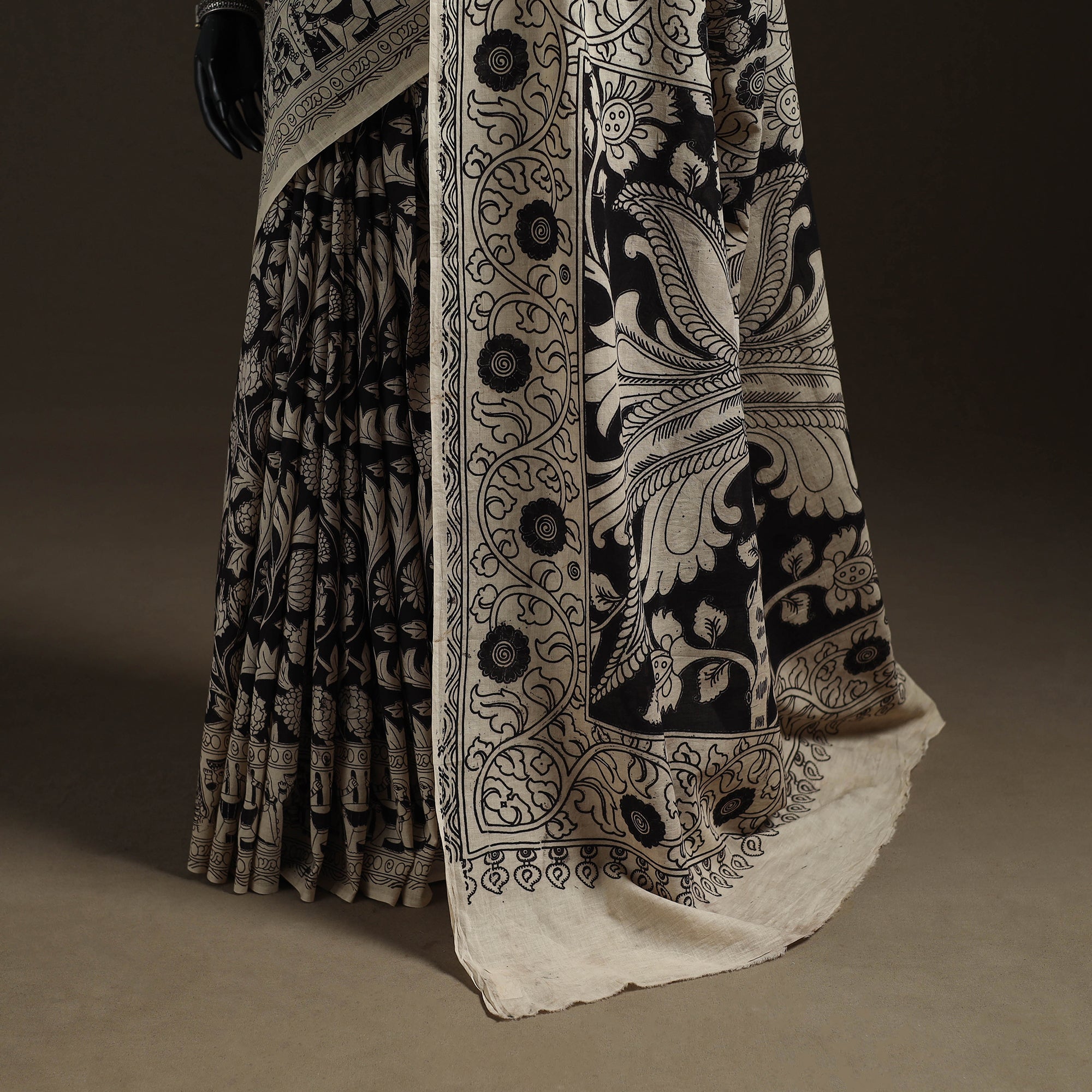 | Material | Kalamkari printed cotton saree, adorned with intricate storytelling patterns using the screen printing technique. The design includes florals, vines, figures and elephants. The lightweight, breathable fabric makes it easy to drape and comfortable to carry throughout the day. Perfect for cultural gatherings, office wear and graceful everyday outings. |