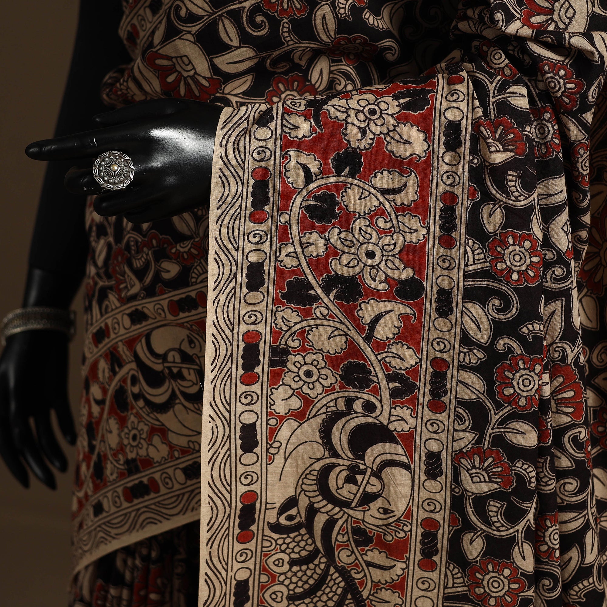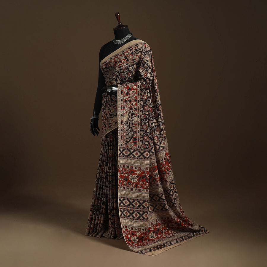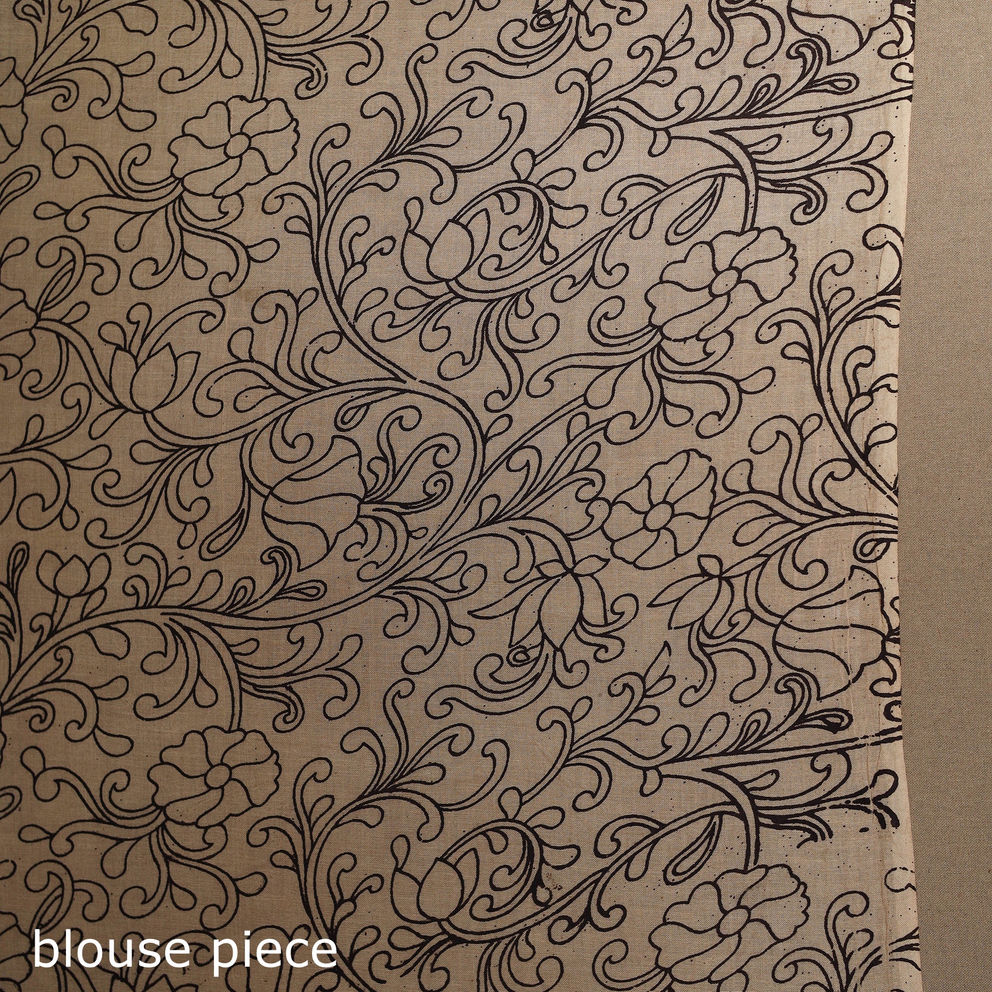 This black kalamkari cotton saree beautifully blends comfort with cultural charm. Adorned with block-printed motifs inspired by Indian traditions, it is perfect for festive gatherings or casual outings. The lightweight, breathable fabric makes it easy to drape and carry through the day.