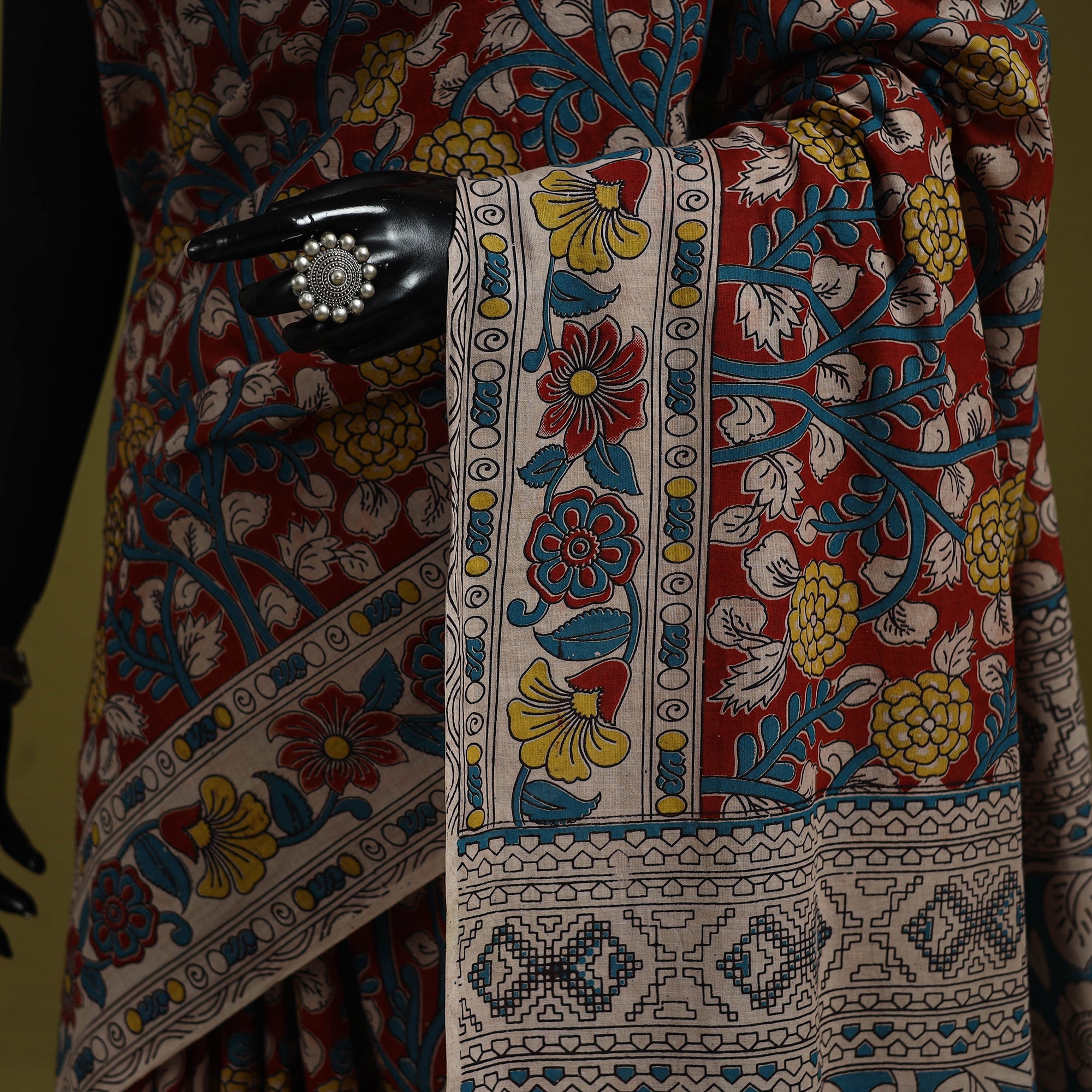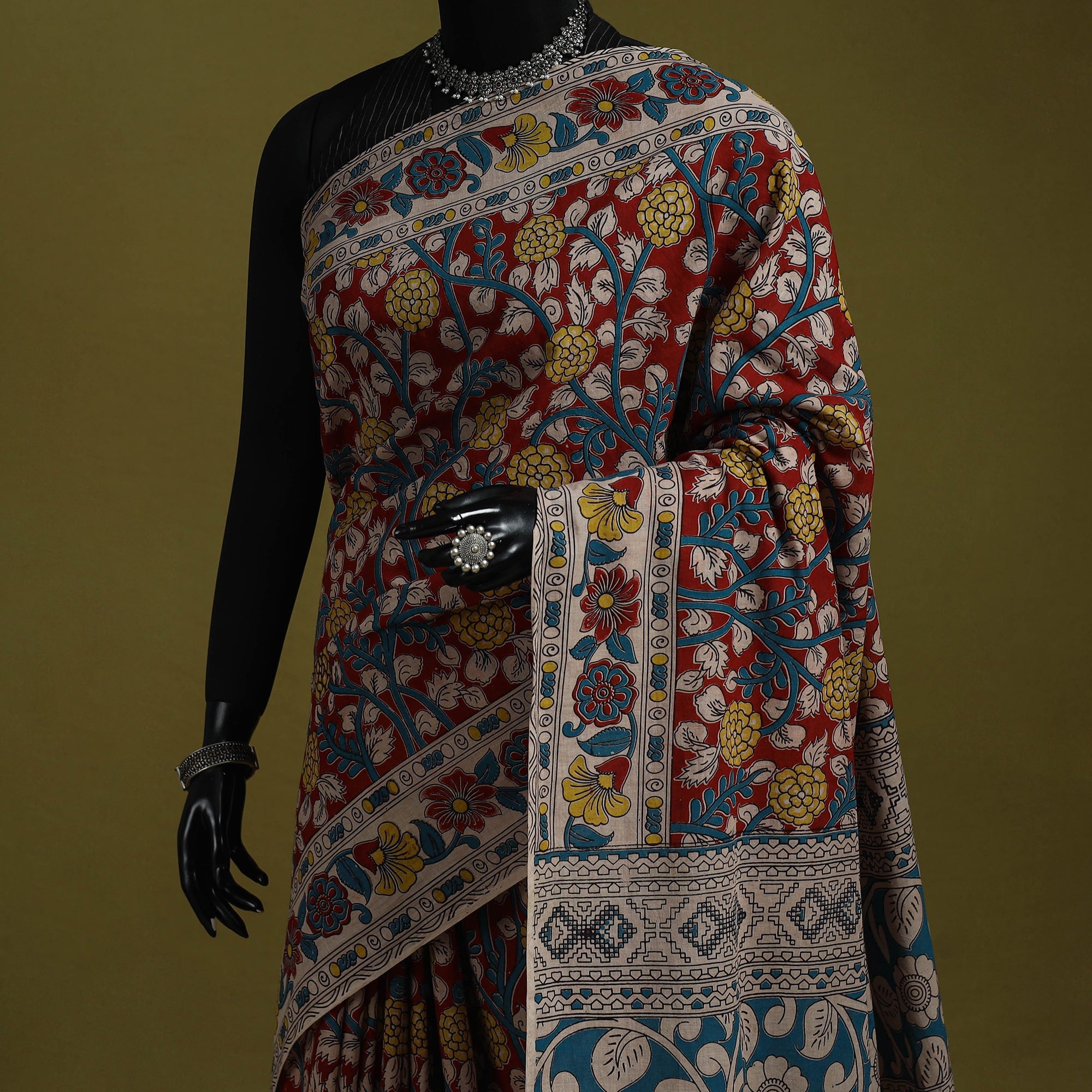 Pure cotton kalamkari saree from Nellore, Andhra Pradesh. Adorned with intricate storytelling motifs, it features detailed screen printed patterns inspired by florals, vines, figures and elephants, highlighting the cultural depth and narrative style of Kalamkari art perfect for cultural gatherings, festive occasions, office wear and graceful everyday outings.