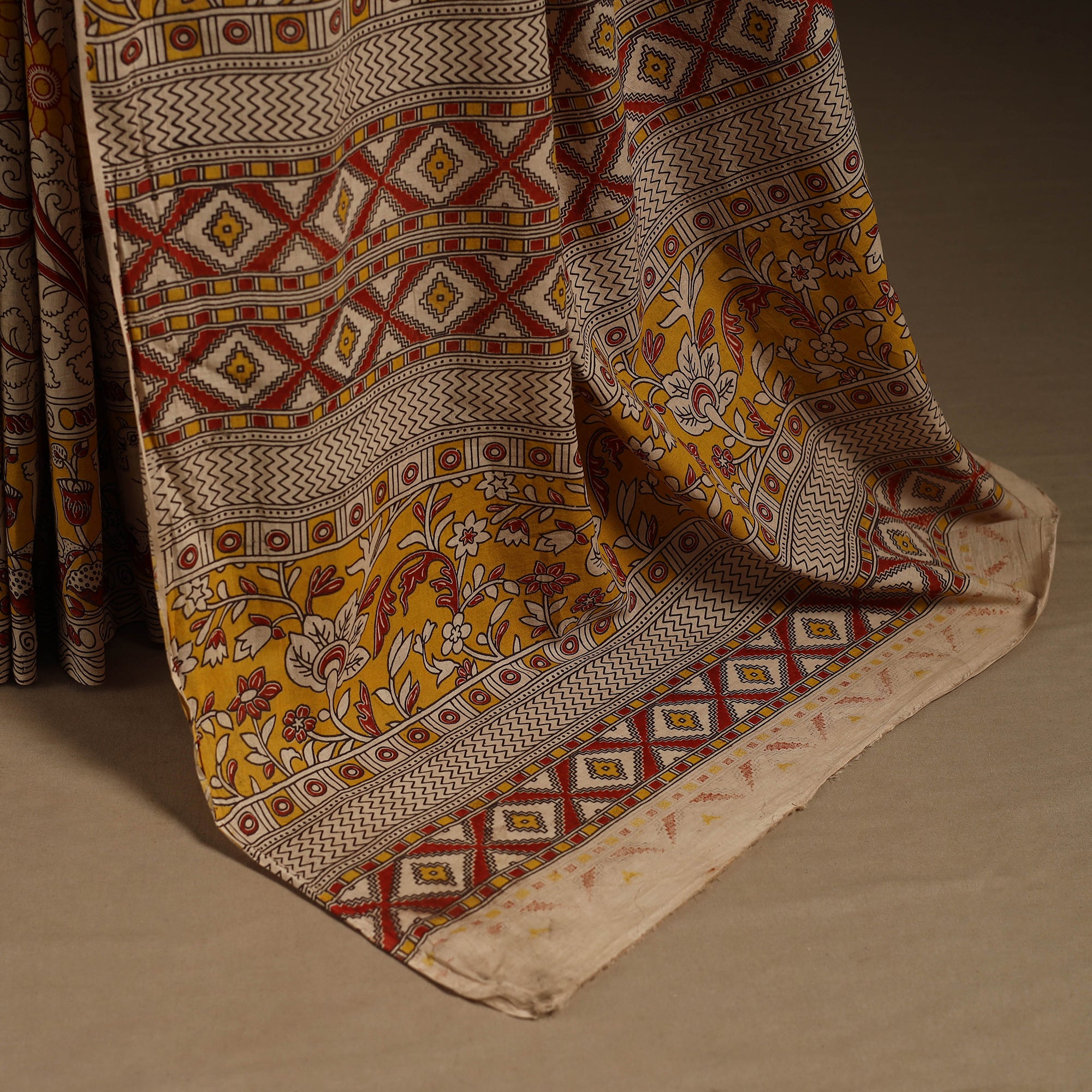 This yellow cotton kalamkari saree celebrates the charm of Nellore’s artistic traditions in Andhra Pradesh. Featuring intricate storytelling motifs, it showcases beautifully block-printed patterns inspired by florals, vines, figures, and elephants. Each detail adds a distinctive character, reflecting the cultural depth of Kalamkari art. Perfect for occasions where tradition meets elegance.