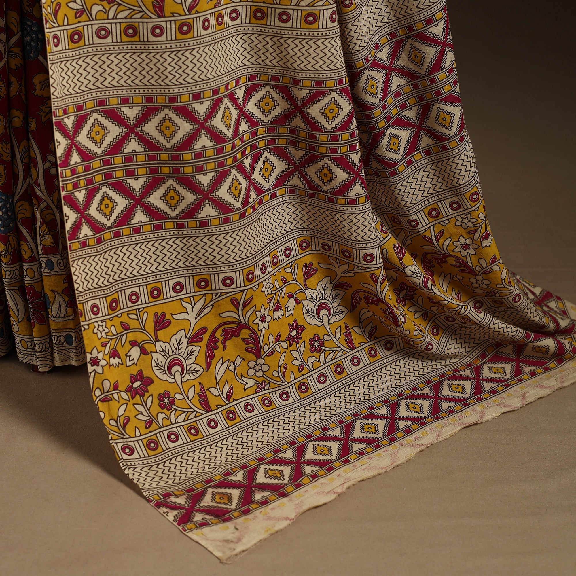 This red cotton kalamkari saree celebrates the charm of Nellore’s artistic traditions in Andhra Pradesh. Featuring intricate storytelling motifs, it showcases beautifully block-printed patterns inspired by florals, vines, figures, and elephants. Each detail adds a distinctive character, reflecting the cultural depth of Kalamkari art. Perfect for occasions where tradition meets elegance.