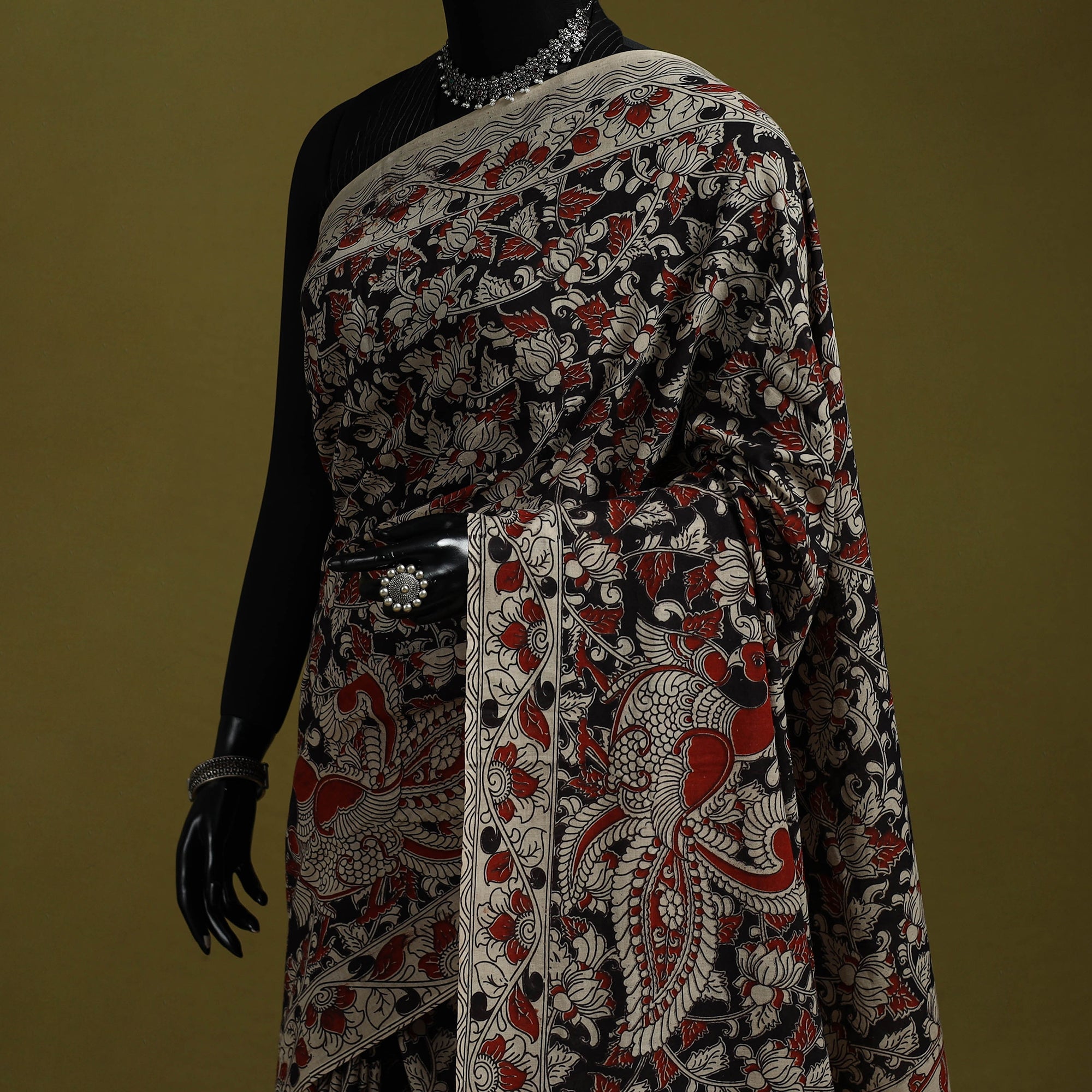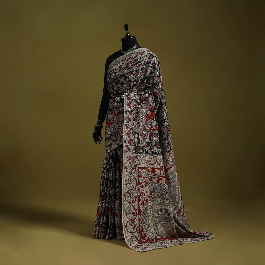 Pure cotton kalamkari saree from Nellore, Andhra Pradesh. Adorned with intricate storytelling motifs, it features detailed screen printed patterns inspired by florals, vines, figures and elephants, highlighting the cultural depth and narrative style of Kalamkari art perfect for cultural gatherings, festive occasions, office wear and graceful everyday outings.