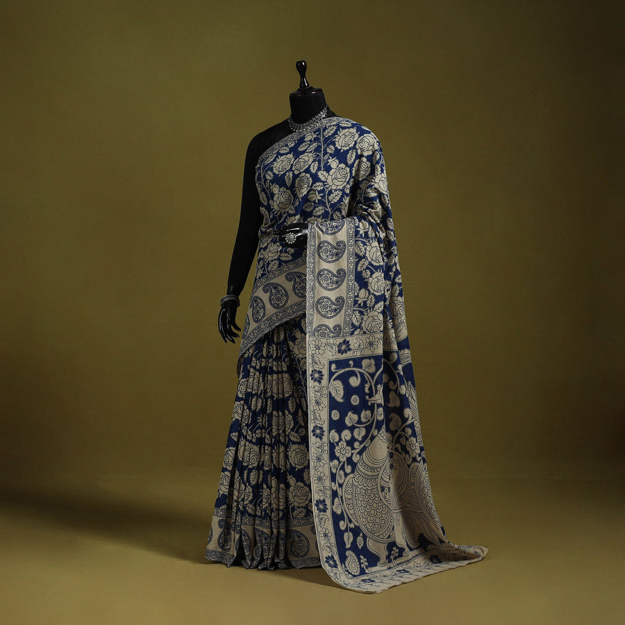 Pure cotton kalamkari saree from Nellore, Andhra Pradesh. Adorned with intricate storytelling motifs, it features detailed screen printed patterns inspired by florals, vines, figures and elephants, highlighting the cultural depth and narrative style of Kalamkari art perfect for cultural gatherings, festive occasions, office wear and graceful everyday outings.