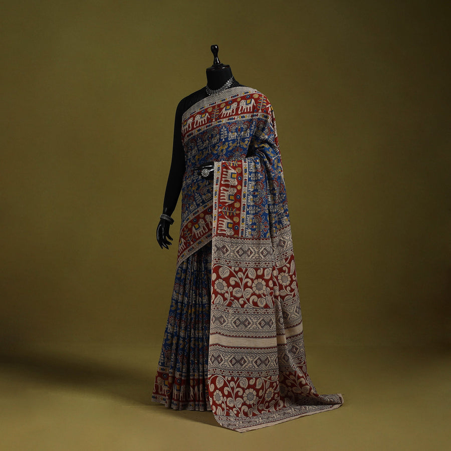 | Material | Blue pure cotton kalamkari saree from Nellore, Andhra Pradesh. Adorned with intricate storytelling motifs, it features detailed screen printed patterns inspired by florals, vines, figures and elephants, highlighting the cultural depth and narrative style of Kalamkari art perfect for cultural gatherings, festive occasions, office wear and graceful everyday outings. |