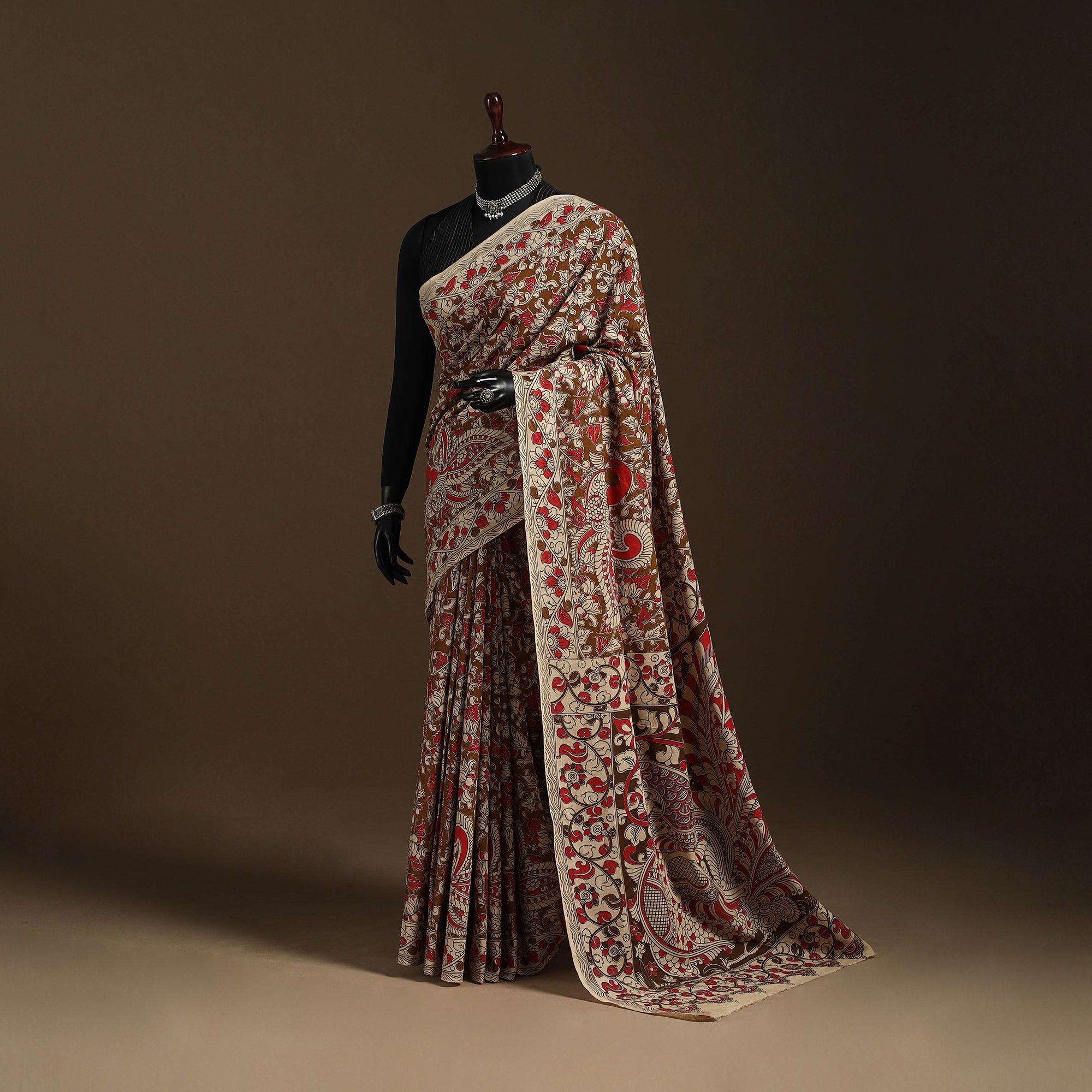 This brown cotton kalamkari saree celebrates the charm of Nellore’s artistic traditions in Andhra Pradesh. Featuring intricate storytelling motifs, it showcases beautifully block-printed patterns inspired by florals, vines, figures, and elephants. Each detail adds a distinctive character, reflecting the cultural depth of Kalamkari art. Perfect for occasions where tradition meets elegance.