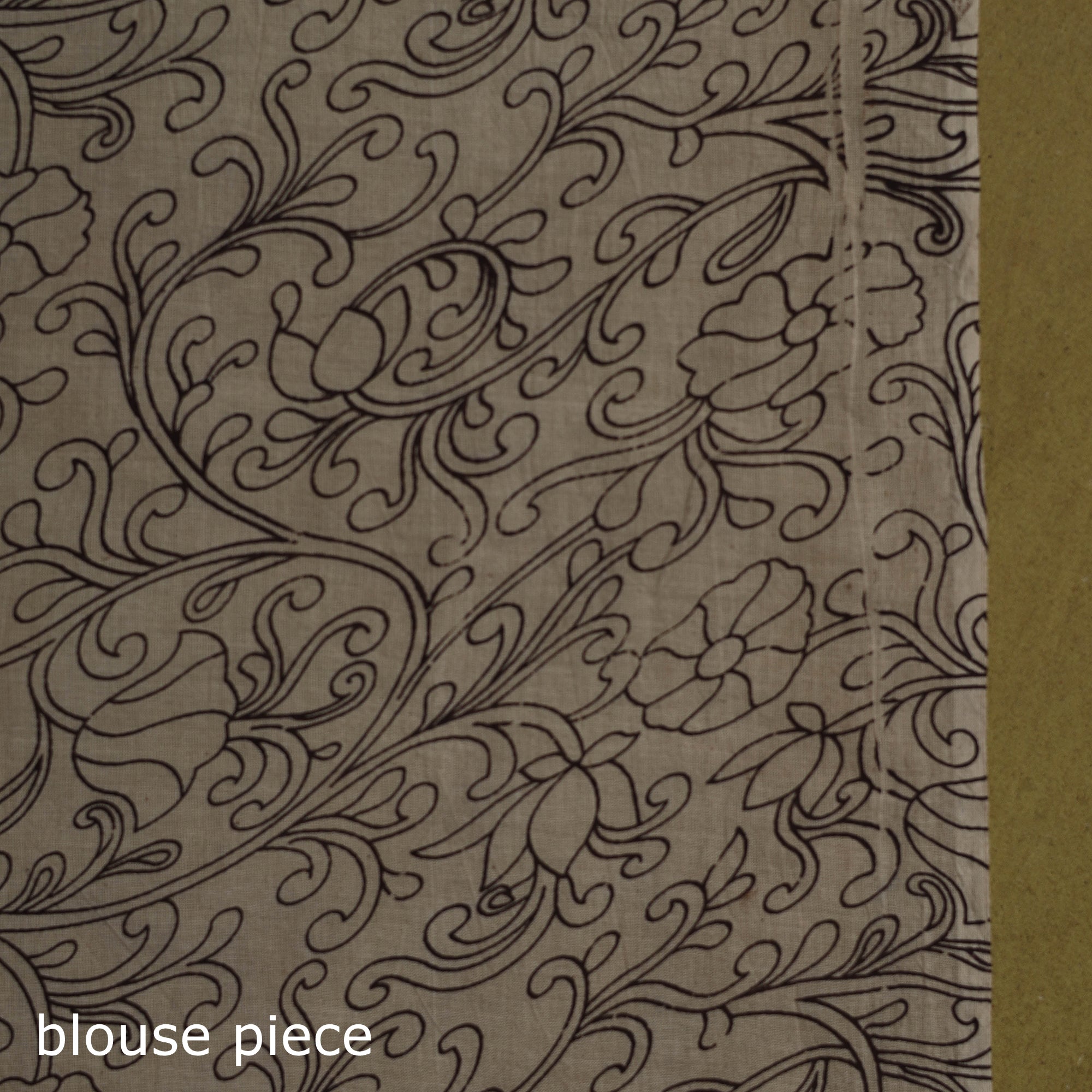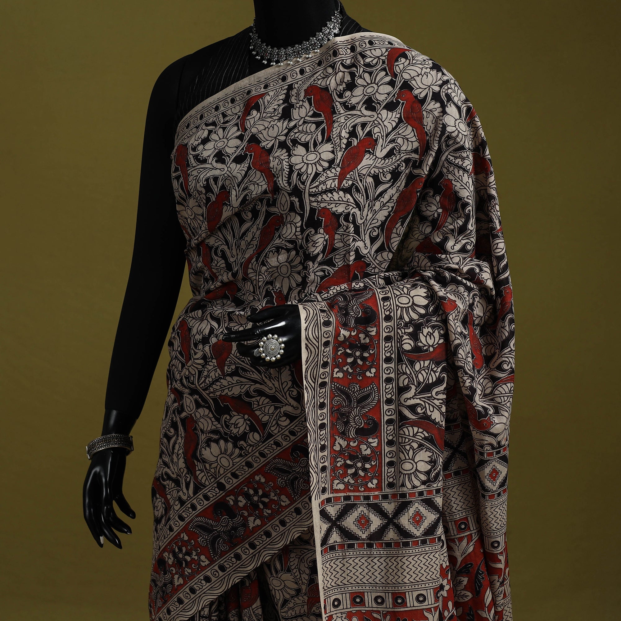 | Material | Black pure cotton kalamkari saree from Nellore, Andhra Pradesh. Adorned with intricate storytelling motifs, it features detailed screen printed patterns inspired by florals, vines, figures and elephants, highlighting the cultural depth and narrative style of Kalamkari art perfect for cultural gatherings, festive occasions, office wear and graceful everyday outings. |